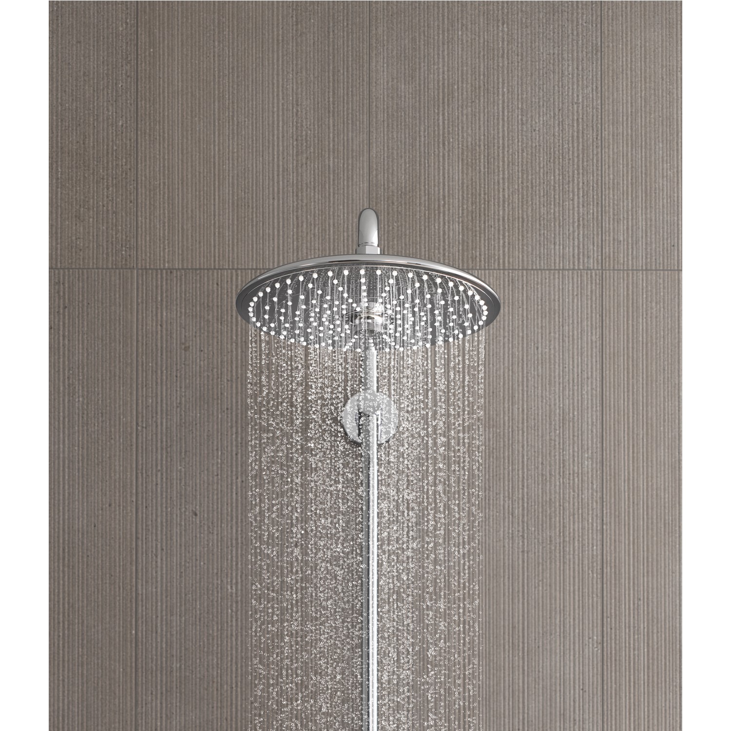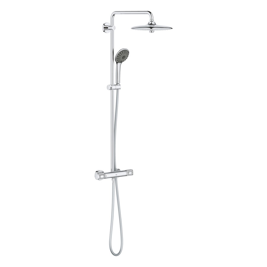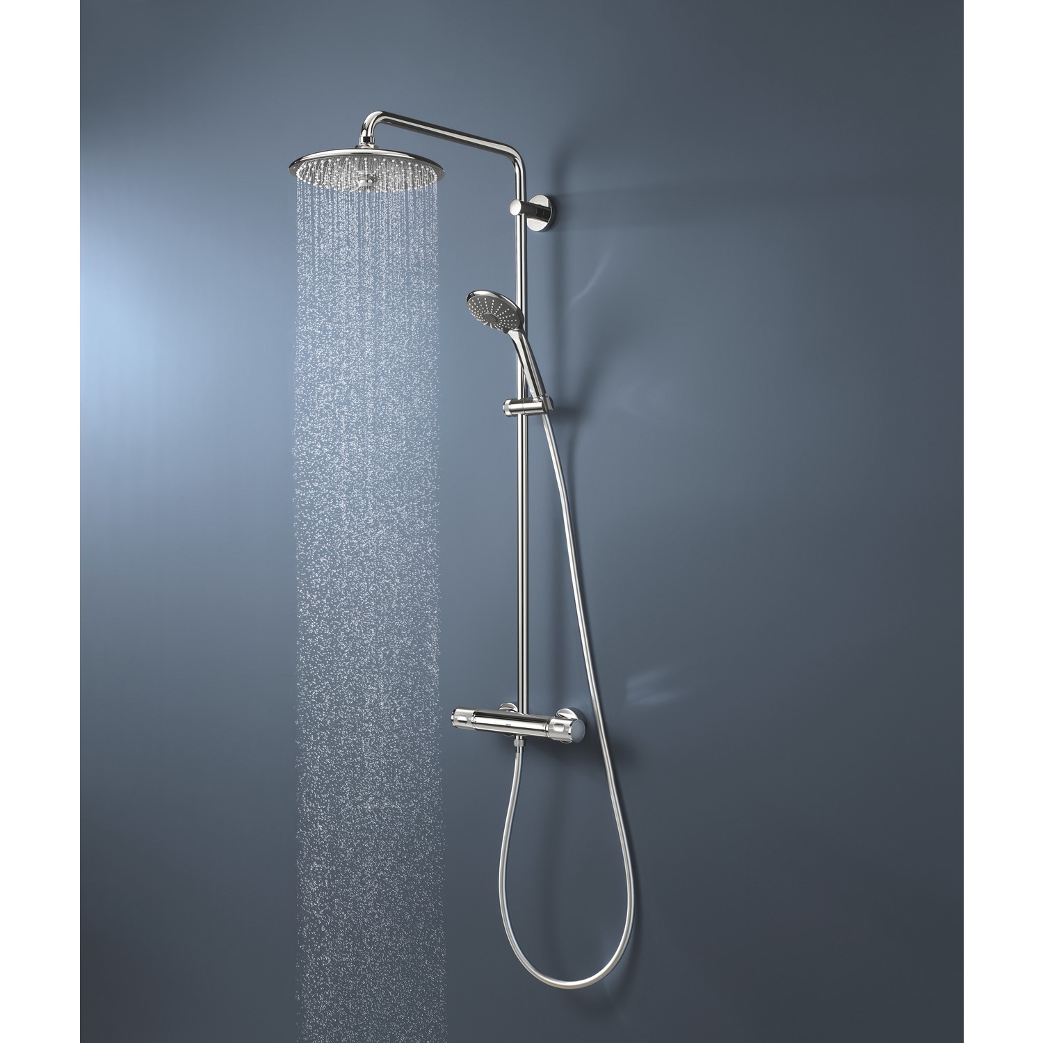 The GROHE Vitalio Joy 260 Thermostatic Shower System offers many benefits in safety, comfort and control. Designed to be wall-mounted, this exposed shower system features a Vitalio Comfort 250 Cube head shower, a Vitalio Start 100 hand shower, thermostat, shower rail with 390mm swivable shower arm and gliding element to adjust the hand shower, plus a 1750mm VitalioFlex Comfort Twistfree hose. The Rain Spray is the gentle and refreshing.There are 2 spray patterns to choose from on the 100mm hand shower such as the soft Rain and the Jet Spray. The hand shower has been designed with an integrated ShockProof silicone ring to protect it against any knocks and drops. Both showers feature water-saving GROHE EcoJoy restraining flow to 9.5l/min on the head shower and 5.7l/min on the hand shower for reduced water consumption but still maintaining great performance.
