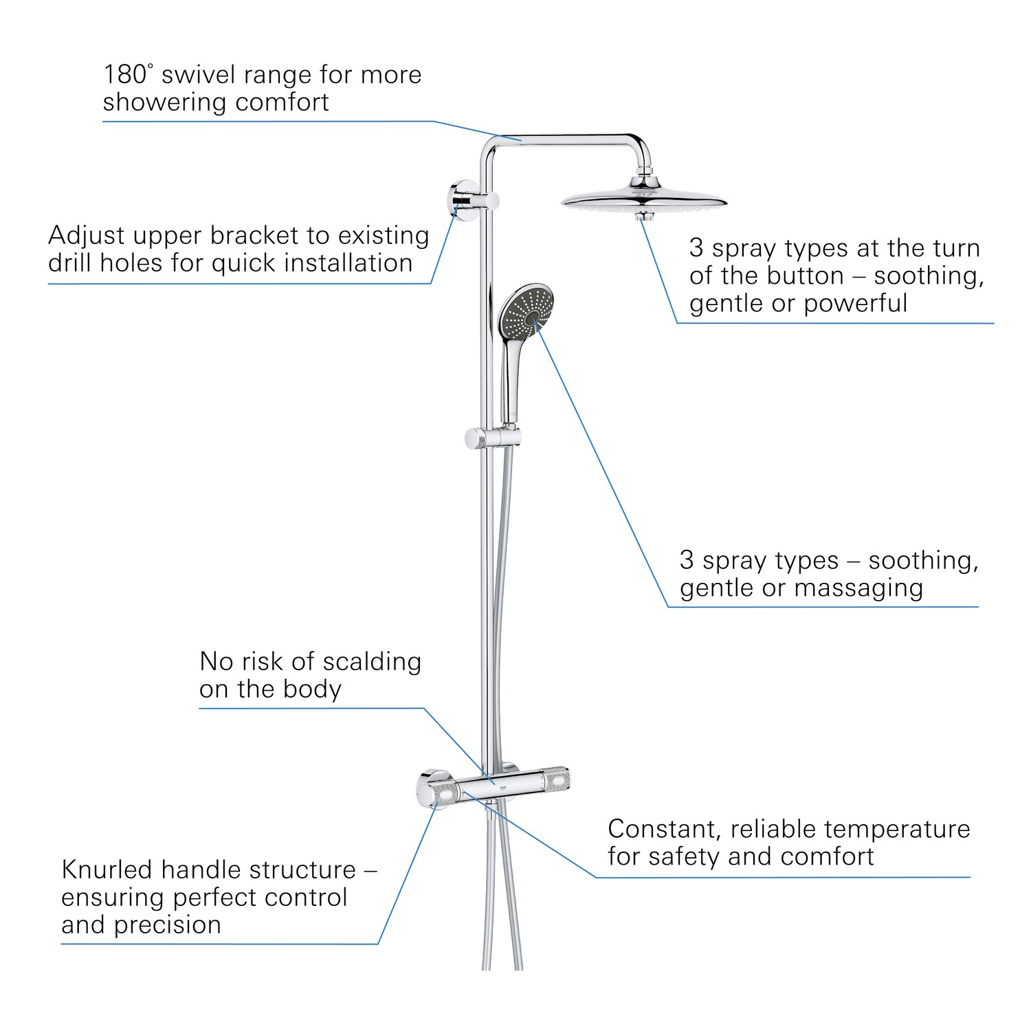 GROHE DreamSpray technology keeps the flow from every nozzle consistent, for a more enjoyable experience. SpeedClean nozzles on the shower makes it easy to clean. The GROHE TurboStat shower system delivers water at a constant temperature. The GROHE SafeStop override button is set at 38°C prevent scalding and the GROHE SafeStop Plus temperature limiter can be set to limit to 43°C to ensure safety. Easily switch between head and bath outlet, and adjust the volume, all via one handle, with the AquaDimmer function. The GROHE StarLight chrome finish will keep the shower looking pristine for years!