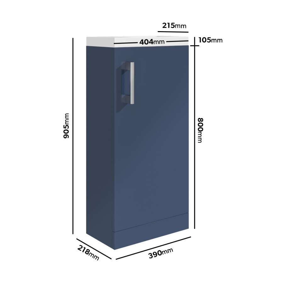 The matt blue basin vanity unit features a soft closing door that opens to ample storage space with one shelf and two compartments. The basin and vanity unit can be fitted left or right handed, and with a depth of only 218mm it makes the ideal storage solution for bathrooms that are tight on space. It includes a chrome unslotted click clack waste and one pre-drilled tap hole. The tap isn't included so you have the freedom to choose your desired cloakroom basin mixer tap.