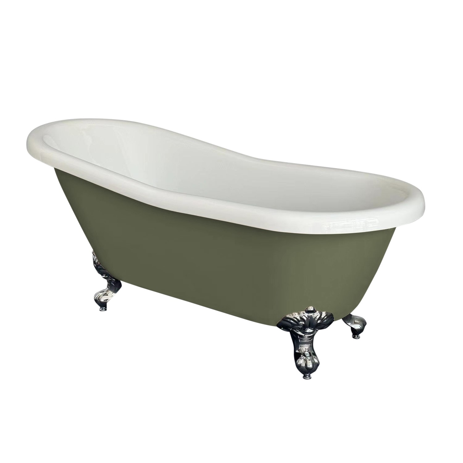 Transform your bathroom with the Bowland Deep Lichen Green Freestanding Single Ended Roll Top Slipper Bath. Its classic slipper design, combined with a modern matt lichen green, creates a striking centrepiece suitable for various bathroom styles. Crafted from durable 4-6mm sanitary-grade acrylic, this bath ensures longevity and comfort. The traditional polished chrome ball and claw feet add a touch of vintage elegance, while the absence of pre-drilled tap holes offers flexibility for tap placement. With a 5-year warranty, this bath combines style, comfort, and peace of mind.