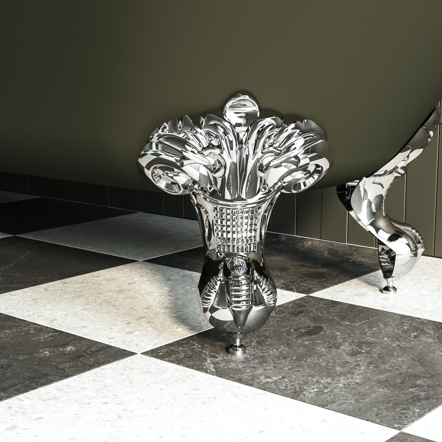 Chrome Detailing: Features polished chrome ball and claw feet and a coordinating chrome bath screen, which is movable 90 degrees inwards and outwards.