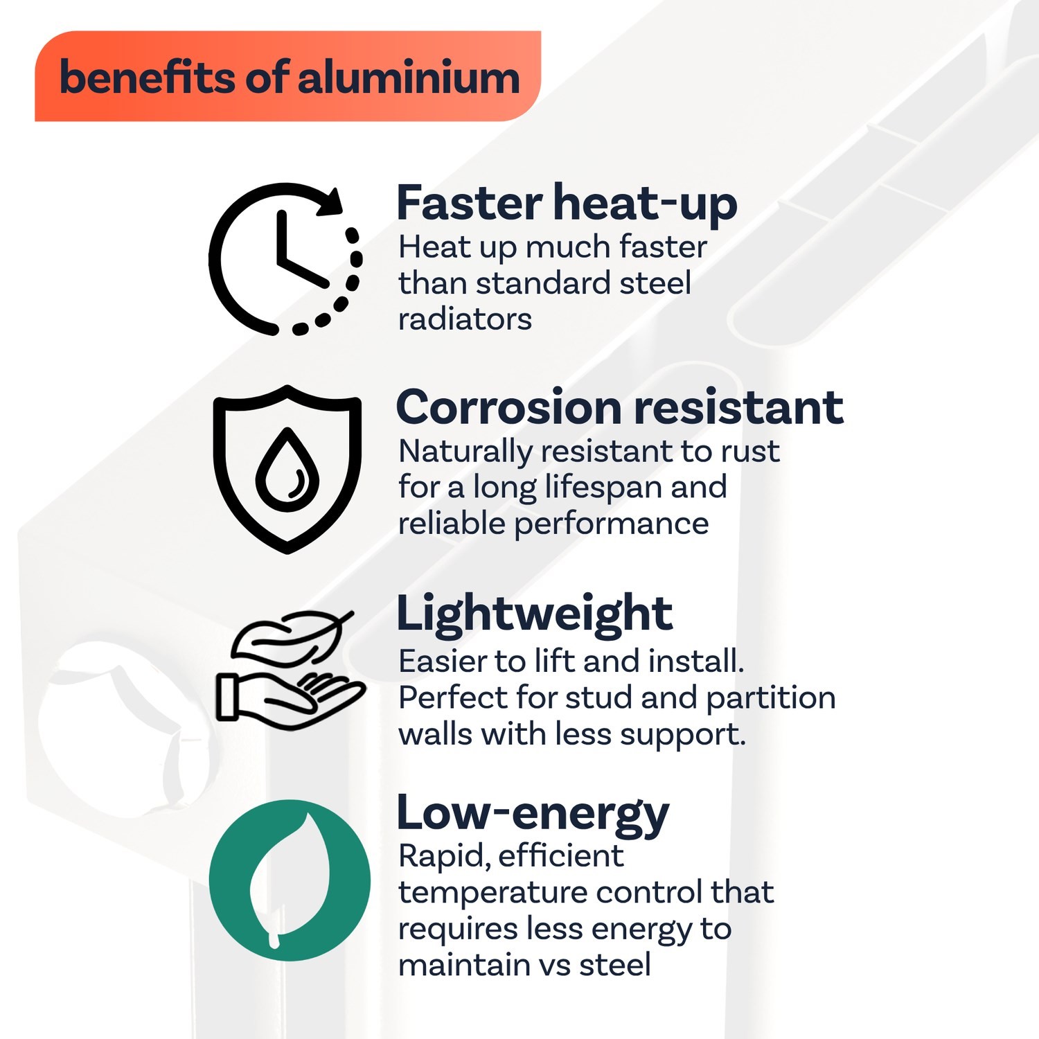 Made from premium aluminium, our radiators are lighter than traditional steel models, making installation easier and more flexible. With superior thermal conductivity, they heat up five times faster than steel, providing instant warmth and on-demand comfort while maximising energy efficiency.