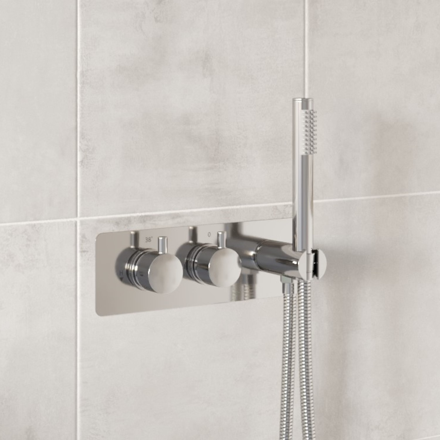The Flow Round shower valve is a fantastic fit to a modern bathroom. The addition of the handset is perfect for small bathrooms with limited space, and is recessed for a streamlined look. Suitable for two outlets, it also comes with a hose for washing hair, cleaning or pets! The strong brass bodies adorned with a chrome finish will complement most shower layouts. The electroplated finish strengthens the tap's resistance to rust and corrosion, boosting longevity and endurance.