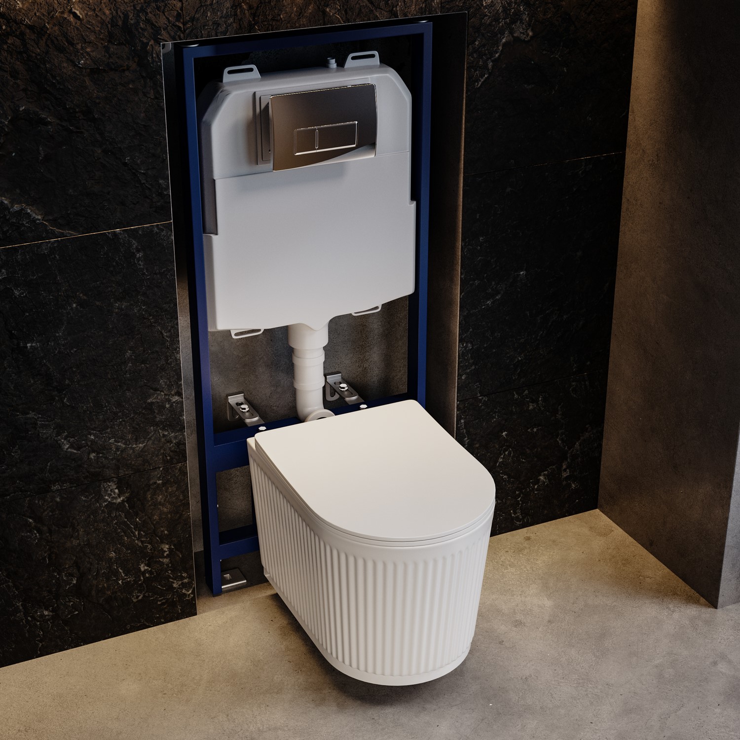 The package also includes a wall-mounted frame with a cistern, a strong and durable tank shell, and a pneumatic chrome flush plate for seamless installation. The 1168mm frame ensures a secure, space-saving solution, ideal for modern bathrooms.