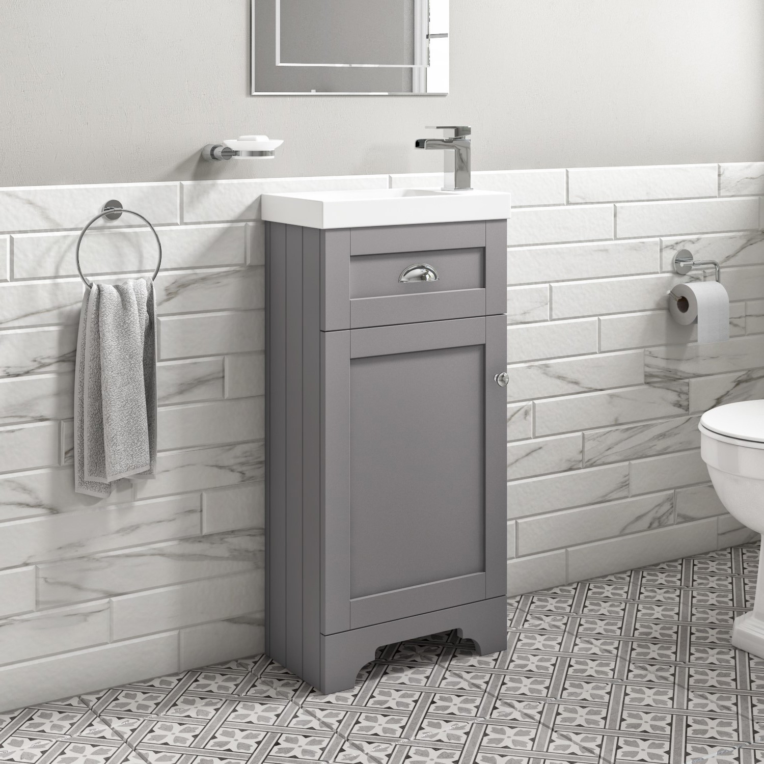 Enhance your bathroom with this Baxenden floor standing vanity basin unit. Characterised by a classic tongue-and-groove side panelling, cup style handles, an ornate front skirting and a matt grey finish, it has that traditional meets modern styling that'll look great in any style of bathroom.