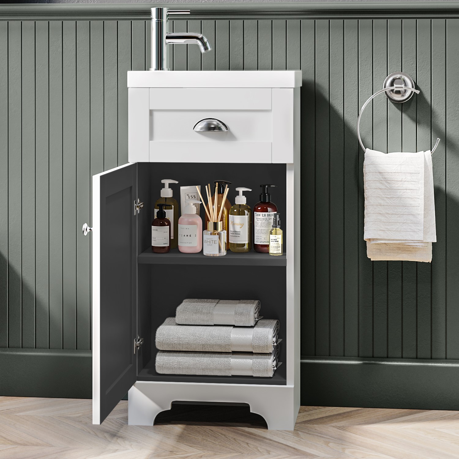 The single door, with stylish metal button handle opens to a handy internal shelf to store your bathroom essentials. There’re even soft-closing hinges to prevent them slamming, providing a quieter closure. The imitation drawer to the top adds additional flair.