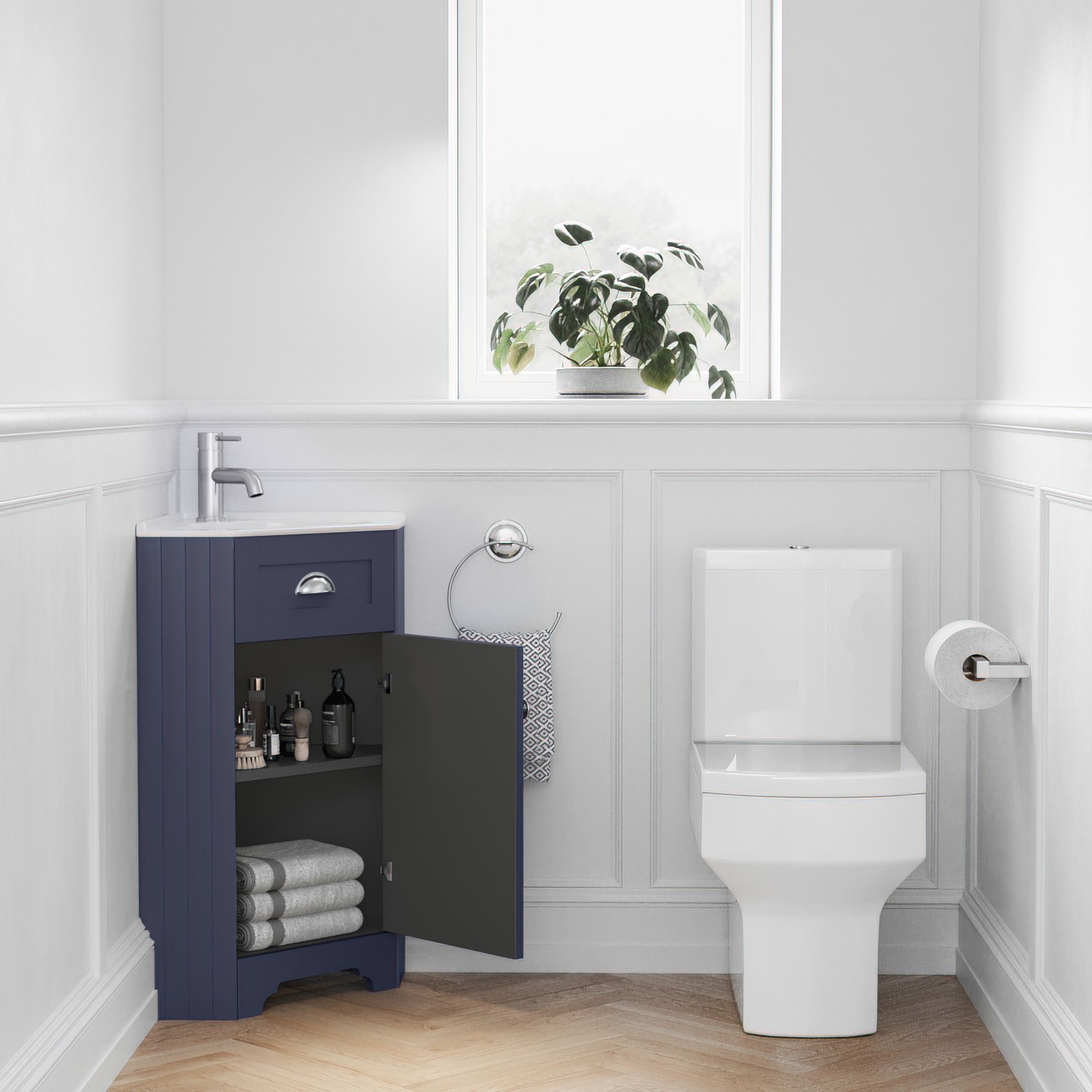 Enhance your bathroom with this Baxenden floor-standing corner vanity basin unit. Characterised by a classic tongue-and-groove side panelling, cup style handles, an ornate front skirting and a matt blue finish, it has that traditional and classic style that will look great in any style cloakroom bathroom.
