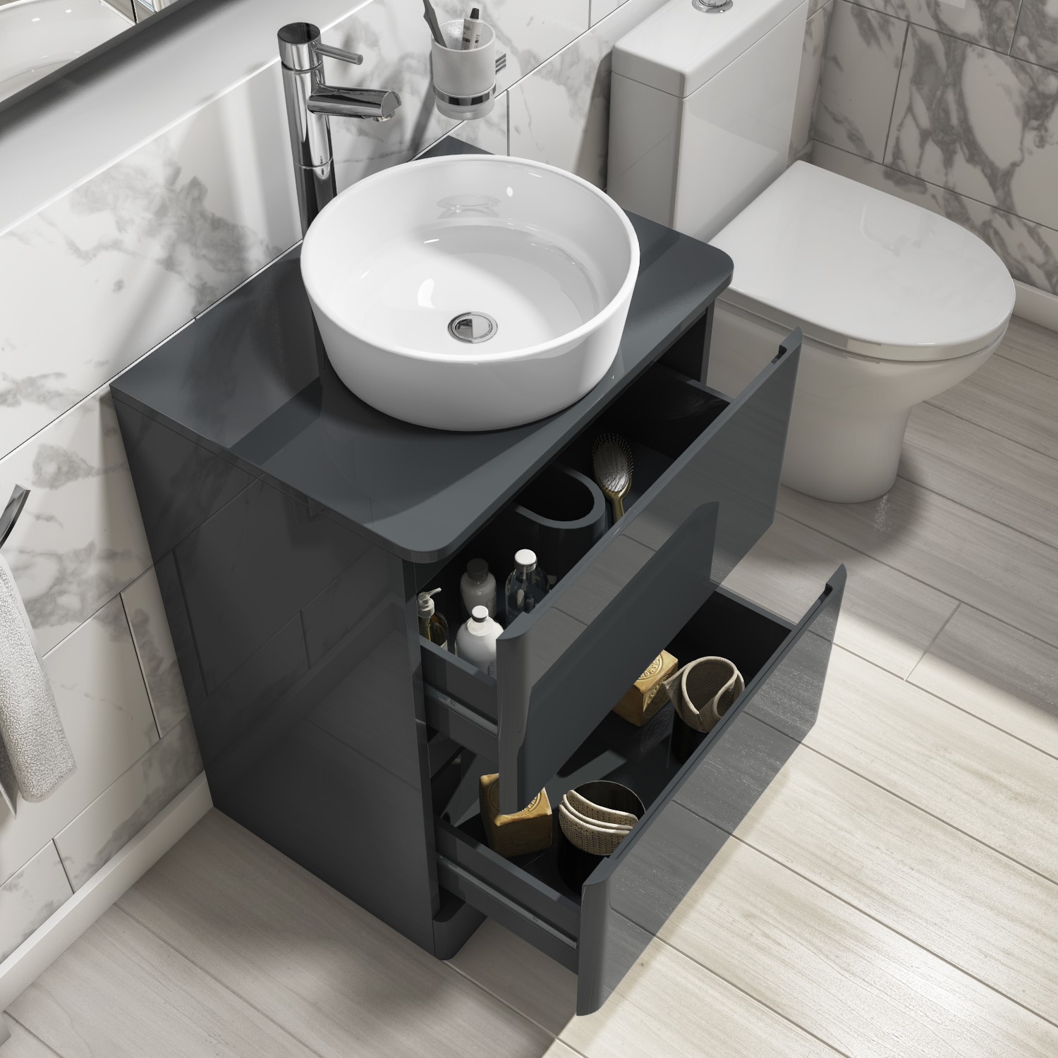 The vanity unit includes a Countertop white basin which has no tap holes; a tap isn't included, so you're free to choose the tap of your choice. It features two drawers with integrated handles giving it that seamless look, each opens up to plenty of storage space for you to keep your toiletries and bathroom essentials within. They're even soft closing to prevent slamming and provide a quieter closing action.
