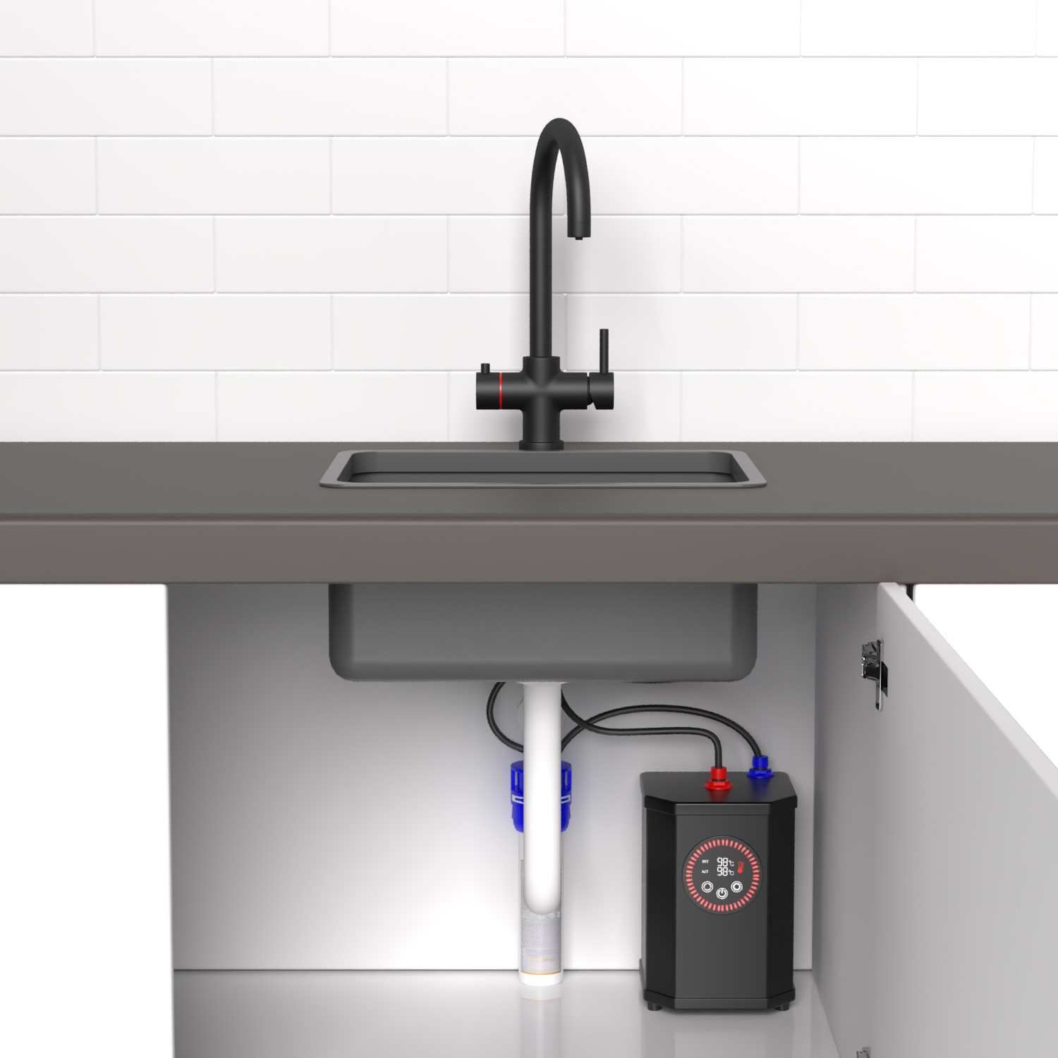 Enjoy cleaner, safer and better-tasting water with this stylish matt black mixer tap which offers the ultimate in kitchen convenience. It provides all your water needs from one single 180-degree swivel spout, be it cold, hot or instant boiling water. You can even make hot drinks, steam veg and cook pasta in no time at all by depressing its safety button and turning. They'll be no more waiting around for the kettle or pan to boil, and what's more, you'll be freeing up space on your kitchen worktop, and the hob.