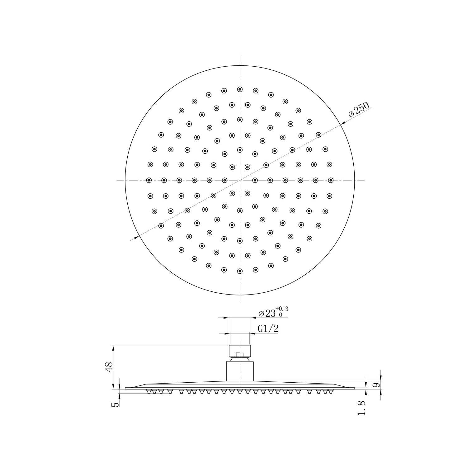 This Ultra Slim round shower head is a must have for any contemporary bathroom. The 250mm round shower head can be perfectly paired with a ceiling or wall arm.
