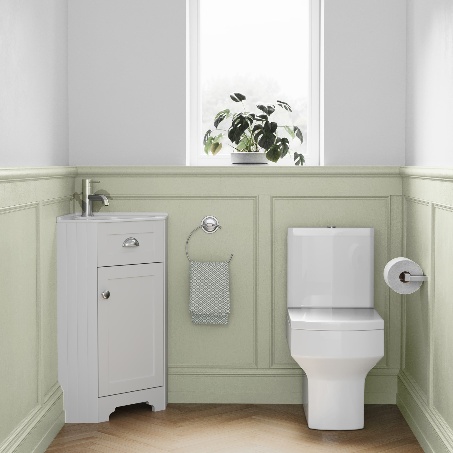 Enhance your bathroom with this Baxenden floor-standing corner vanity basin unit. Characterised by a classic tongue-and-groove side panelling, cup-style handles, an ornate front skirting and a matt white finish, it has that traditional and classic style that will look great in any style cloakroom bathroom.
