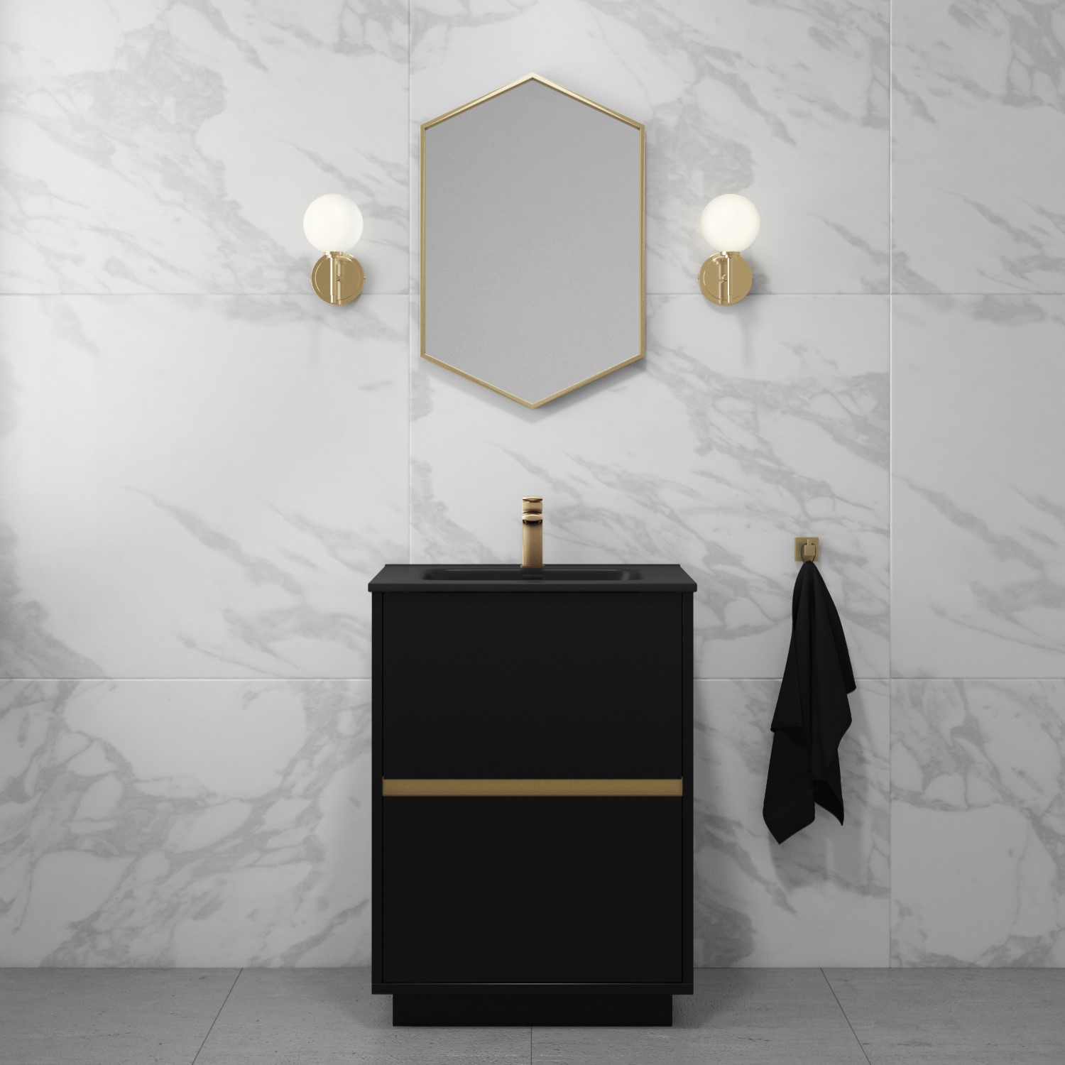 - Chic freestanding black vanity unit with matt black inset basin