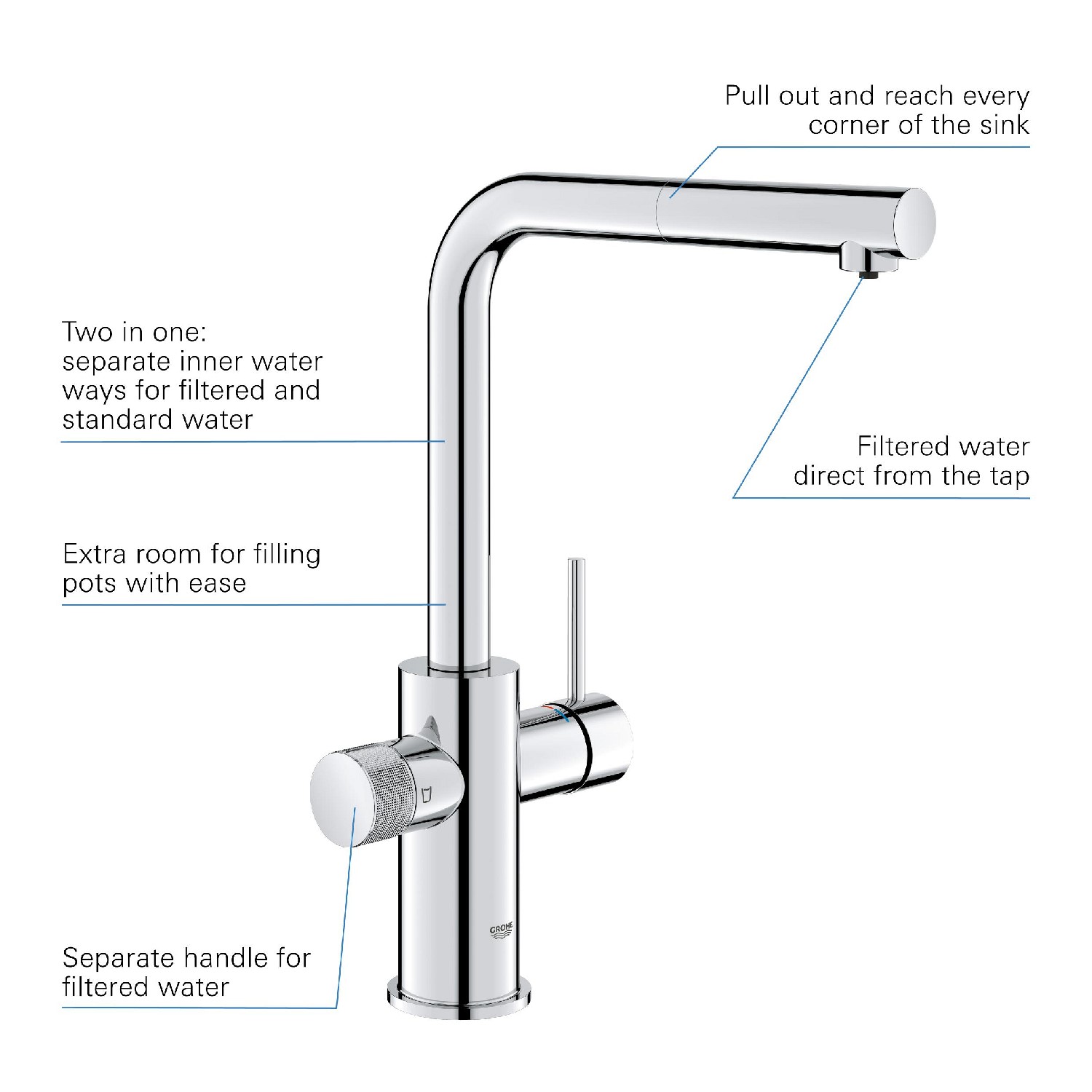 The spout has a 150˚ swivel action which has mousseur spray, this mixes the water with air, limiting flow rate and water usage. The Silk Smooth ceramic cartridge ensures a smooth water flow with no splashes and protects against backflow which damages your tap. The Grohe Blue water filter best suits hard water areas to create a premium clear taste. The maximum capacity of water usage is 600L at 20°. The tap is designed with a single lever for normal tap usage and a knurled handle for fresh filtered water.