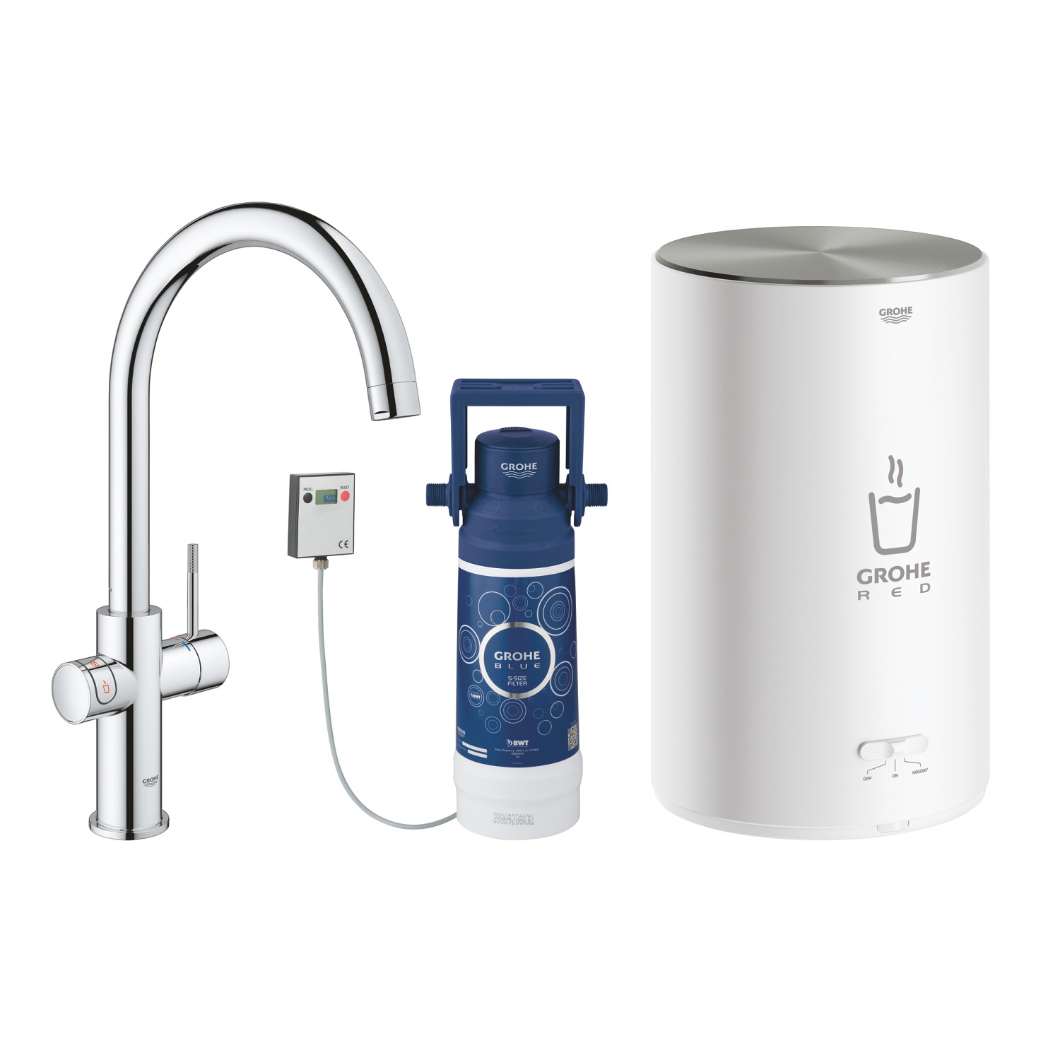 It features a titanium M-size boiler that sits under the sink freeing up precious space on the work surface. Rated A for energy efficiency, you can also switch the boiler to Holiday Mode, where the temperature is limited to 60° C, ensuring further savings. The GROHE Red filter also reduces limescale and heavy metals in the water, prolonging the life of both tap and boiler.
