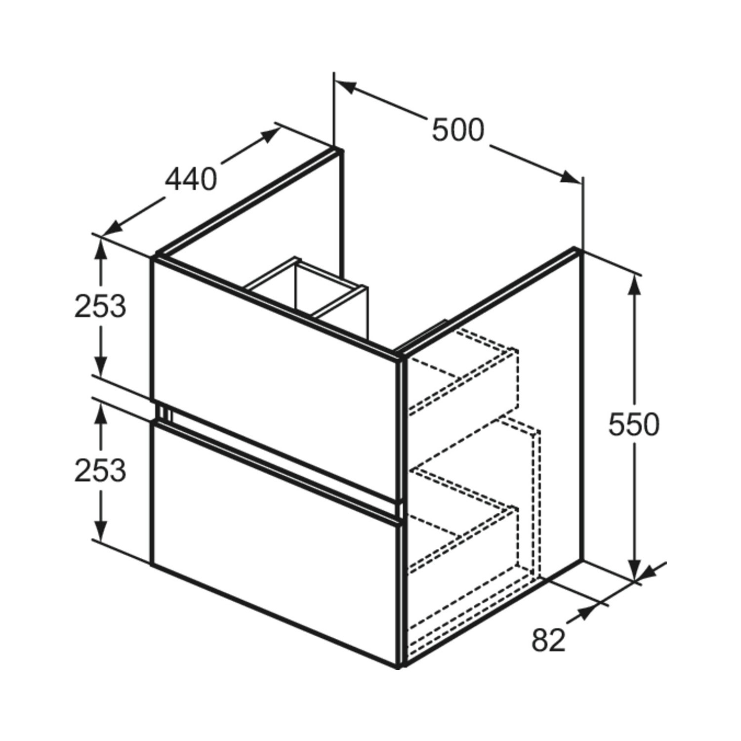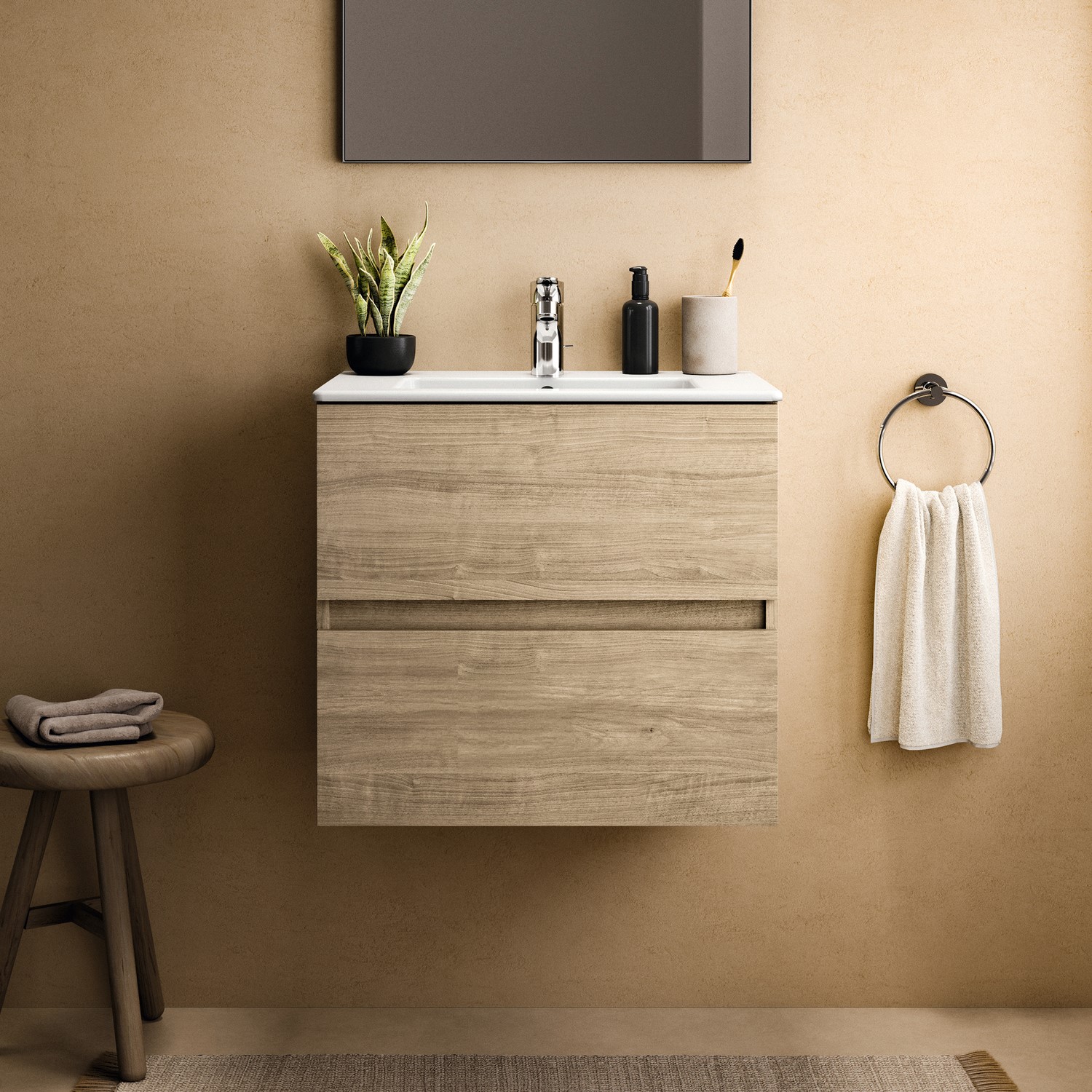 Enhance your bathroom with the modern Eurovit+ 500mm wall hung vanity unit from Ideal Standard, finished in a warm oak effect. This vanity unit makes brilliant use of small spaces with its 500mm width whilst providing essential storage, making it perfect for en-suites or cloakrooms. The wall mounted installation opens up your floor space, giving the illusion of more space and making floor cleaning a breeze. The two soft close drawers make it easy to store your toiletries and cleaning products, whilst the wood effect finish instantly updates your room and is easy to wipe down and maintain. The unit also features a minimalist handle-free design giving a sleek, modern look with concealed handles for clean lines and a clutter-free finish. Crafted from PEFC-certified wood, the Eurovit+ collection aligns with Ideal Standard’s commitment to sustainability and eco-friendly product development, meaning the vanity unit is crafted with wood from forests managed sustainably, balancing environmental, social, and economic needs.