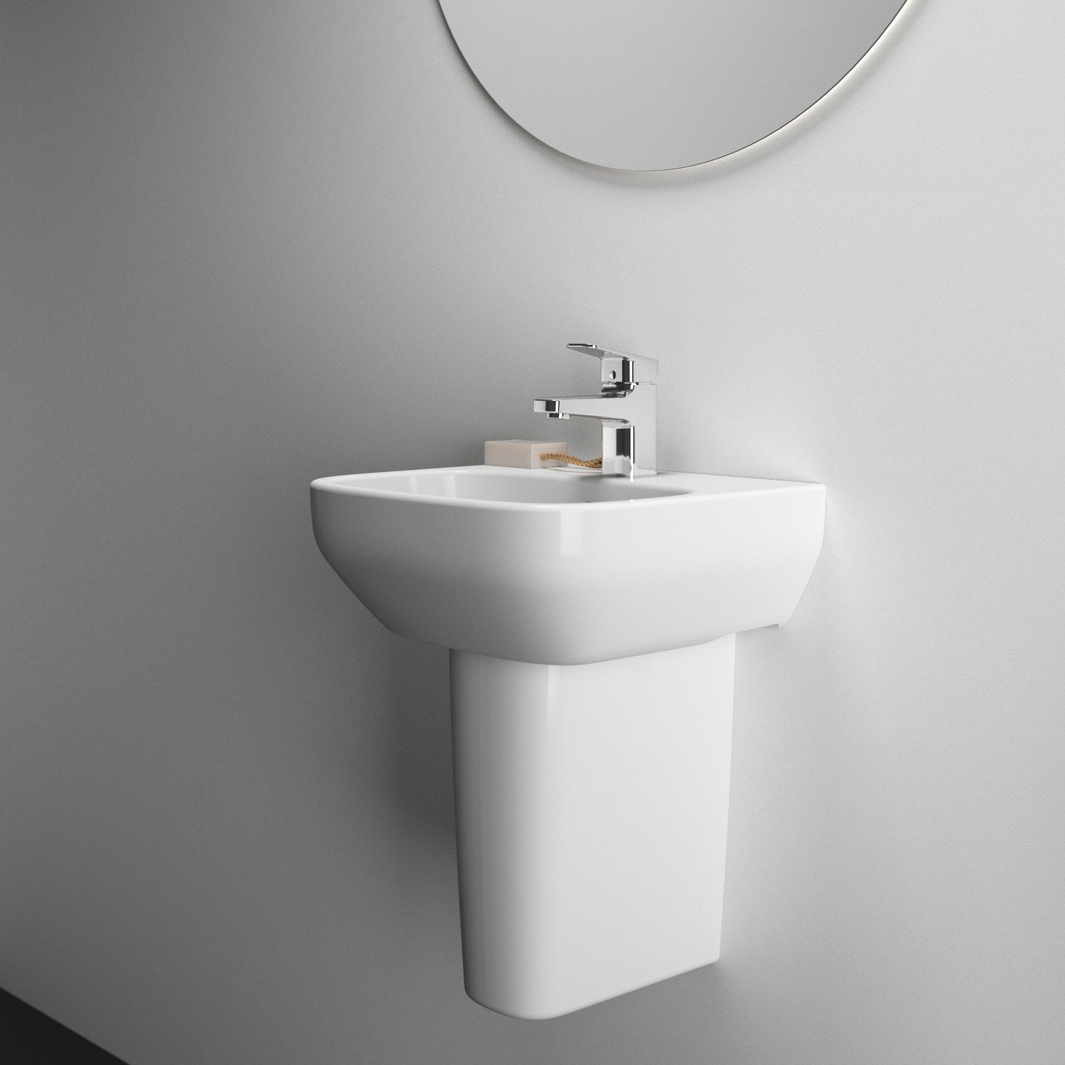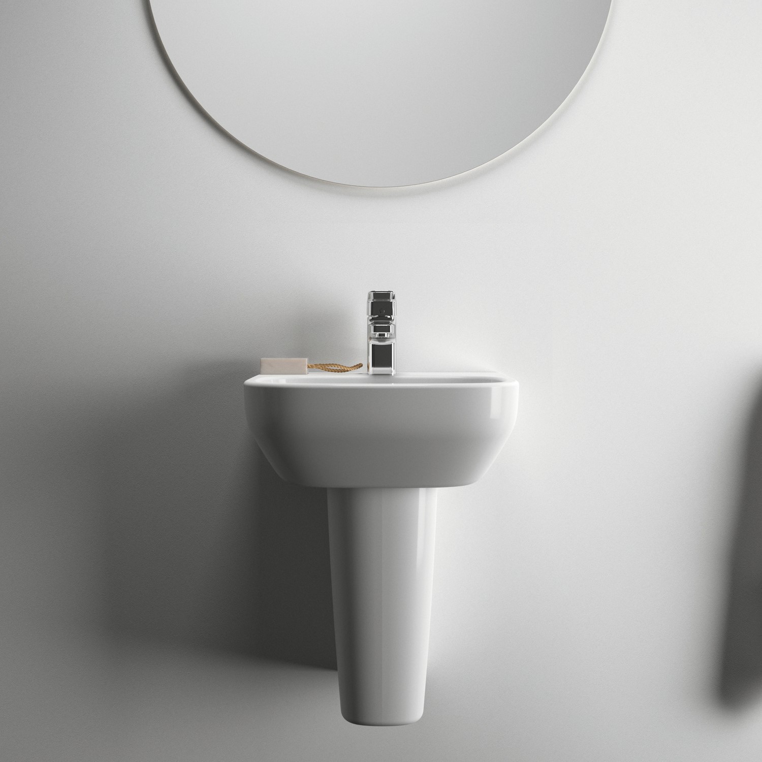 Bring effortless elegance to your space with the i.Life A 400mm Semi Pedestal Basin from Ideal Standard. Combining modern rectangular curves with a practical semi-pedestal that conceals unsightly pipework and gives the illusion of open floor space, this sink is designed for both beauty and function. The compact 400mm width and 360mm depth makes this size basin perfect for smaller bathrooms, cloakrooms or en-suites. Featuring one central tap hole, it's ideal for a mono basin mixer tap of your choice. The overflow is coverless meaning you can pair this basin with brassware in any finish. Crafted from high-quality ceramic and finished with a glossy enamel coating, it’s built to stand the test of time while adding a fresh, contemporary touch to your bathroom, and is backed with Ideal Standard's lifetime guarantee for peace of mind.
