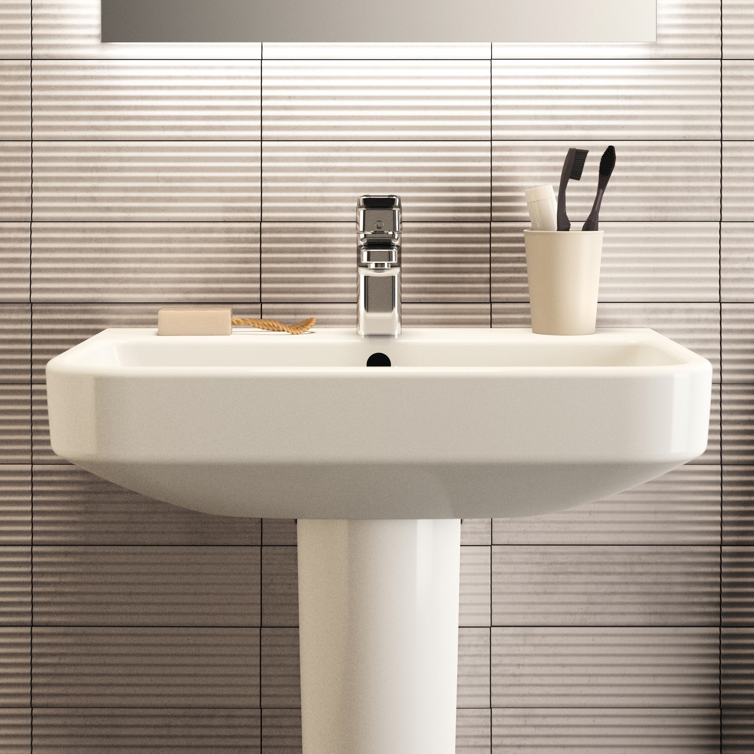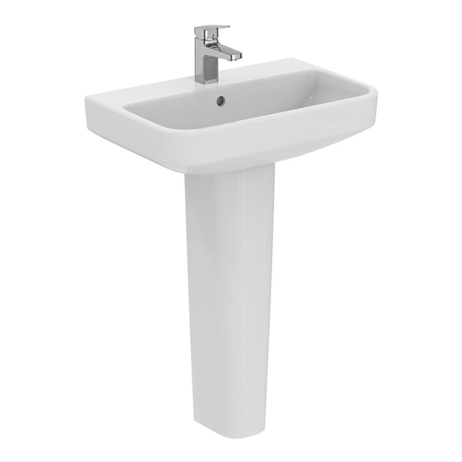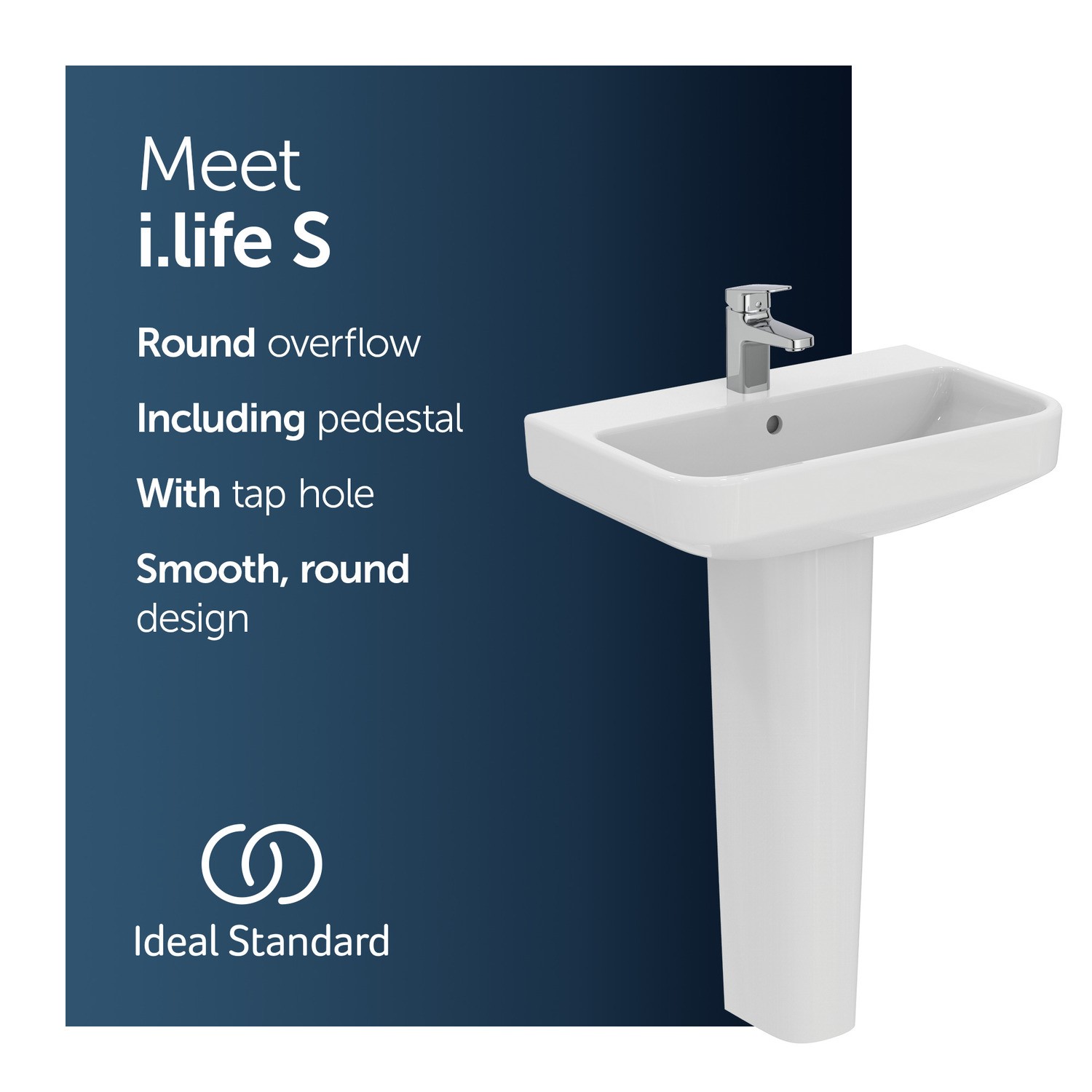 Enhance your bathroom with the i.Life S Compact 600mm Full Pedestal Basin from Ideal Standard. Combining modern rectangular curves with a practical pedestal that conceals unsightly pipework, this space-saving sink is designed for both beauty and function. The basin design features a shorter 380mm depth making this sink perfect for compact or smaller spaces, such as cloakrooms or en-suites. Featuring one central tap hole, it's ideal for a mono basin mixer tap of your choice. The overflow is coverless meaning you can pair this basin with brassware in any finish. Crafted from high-quality ceramic and finished with a glossy enamel coating, it’s built to stand the test of time while adding a fresh, contemporary touch to your bathroom, is easy to clean and maintain whilst being backed with Ideal Standard's lifetime guarantee for peace of mind.