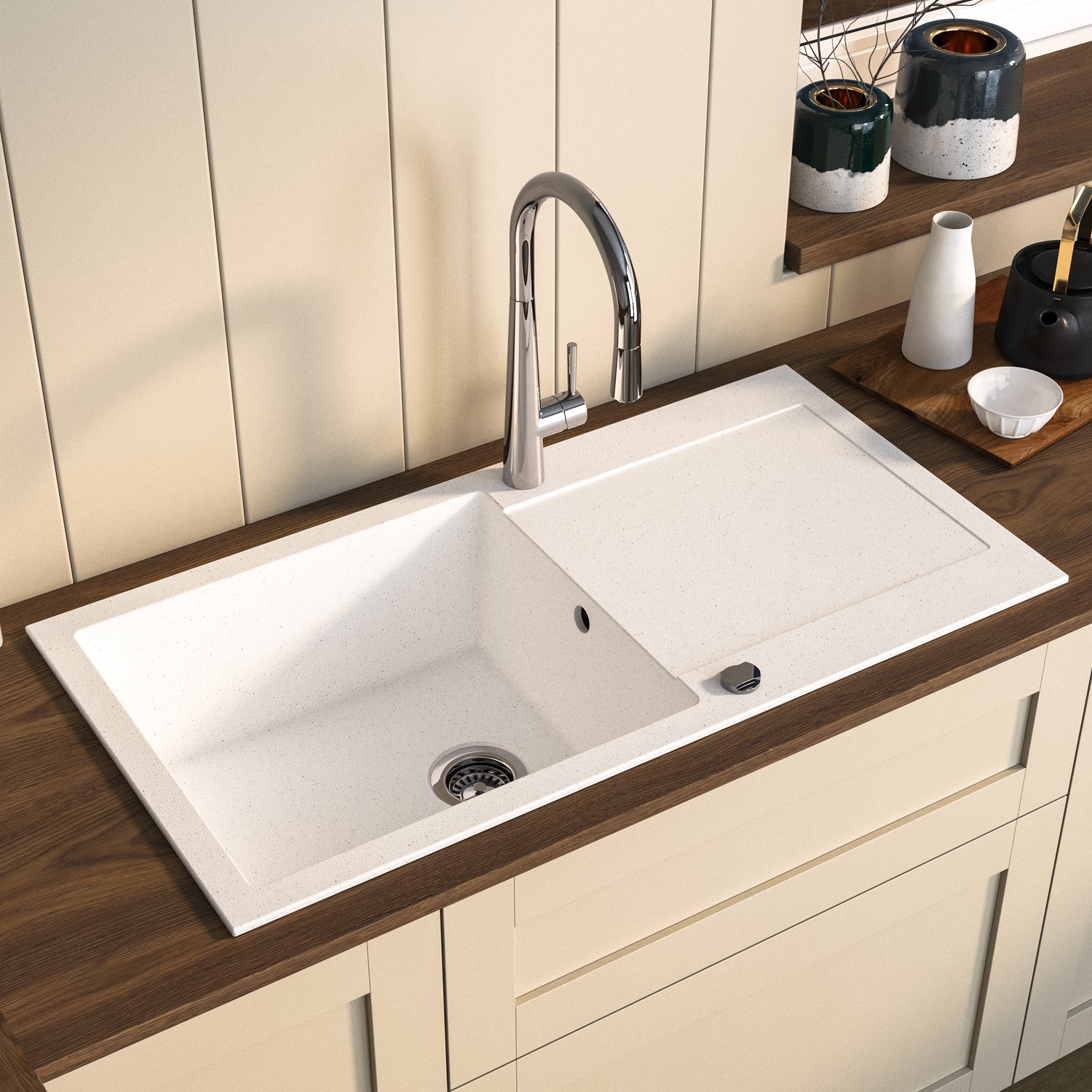 The Laurie granite composite kitchen sink combines natural beauty with exceptional durability, creating a stunning and practical centre piece for your kitchen. Made from a precise blend of natural granite stone and high-performance resin, this material offers the timeless appeal of real stone with added strength and resilience for everyday use.