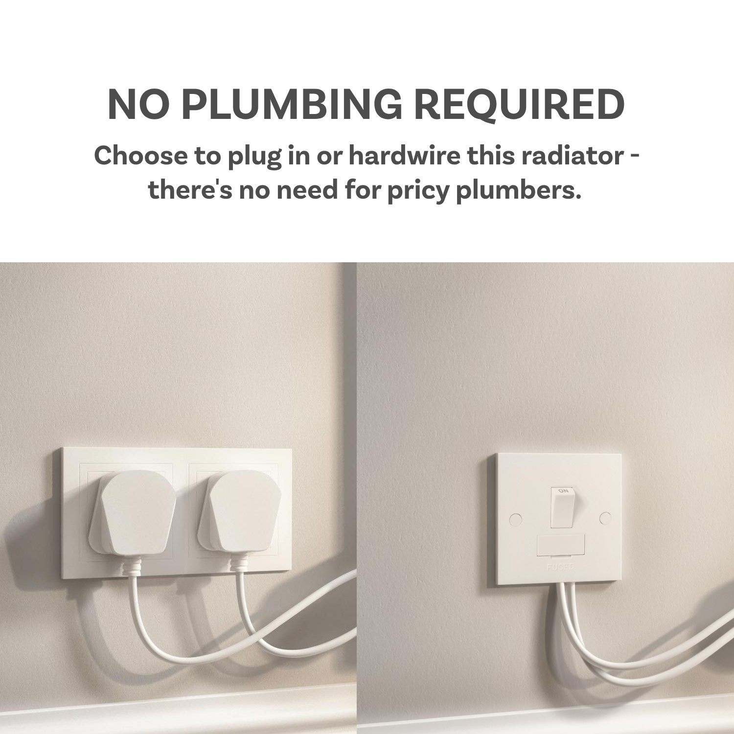 There’s no plumbing required with this modern designer radiator, which means installation is quick and straightforward. Simply mount it on the wall and plug it in. It features a digital thermostat for quick adjustments and can also be controlled via the intuitive Tuya app. Perfect on those noticeably cooler days; turn your radiator on with the touch of a button, ready for your arrival.
