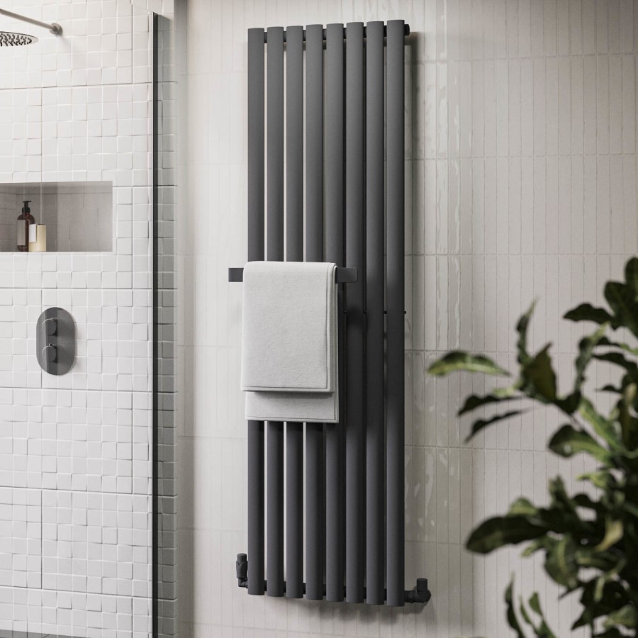 The Margo anthracite vertical radiator will add a modern touch to any bathroom. The radiator comes with a convenient towel bar so you can easily hang your wet towels. The maximum weight limit for the towel bar is 3kg. The towel bar is made from steel with a plated finish. To maintain the surface of your product, wipe with a clean damp cloth and wipe dry. The single panel radiator features 8 rounded bars and has a high BTU of 2871 so perfect for medium to large bathrooms.