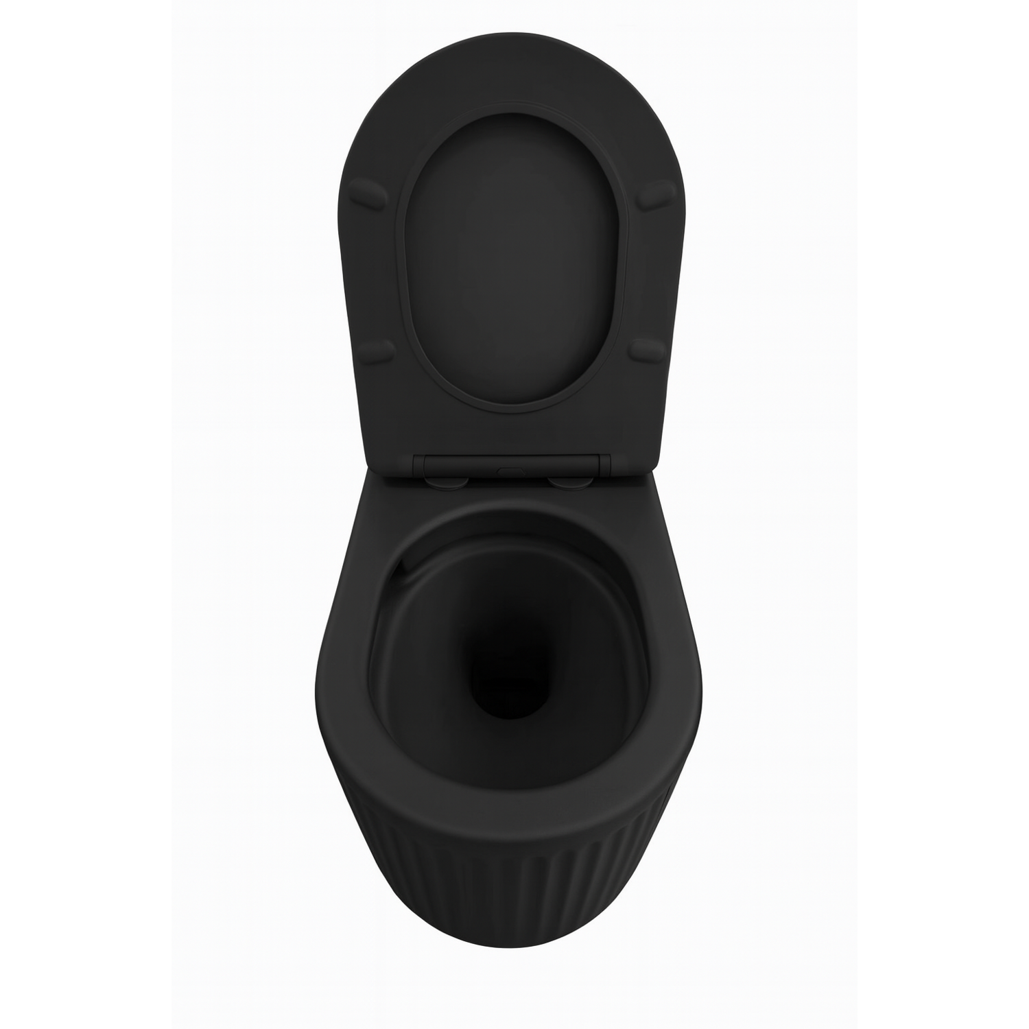 Contemporary Wall-Hung Design: The Oregon Wall Hung Toilet in matt black offers a modern touch with a sleek, space-saving design. The elegant fluted/ribbed detailing on the ceramic body adds a refined, textured element, elevating the overall design and creating a unique, luxurious look. The seat has matching black hinges, making it easy to coordinate with your bathroom theme.