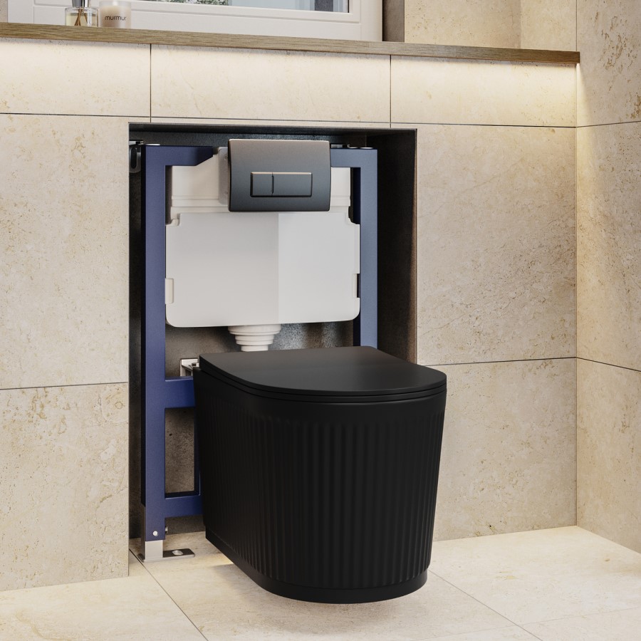 Contemporary Wall-Hung Design: The sleek Oregon Wall Hung Toilet in matt black adds modern style and saves space. The fluted/ribbed detailing on the ceramic body enhances the design, creating a unique and luxurious look. The seat has matching black hinges, making it easy to coordinate with your bathroom theme.