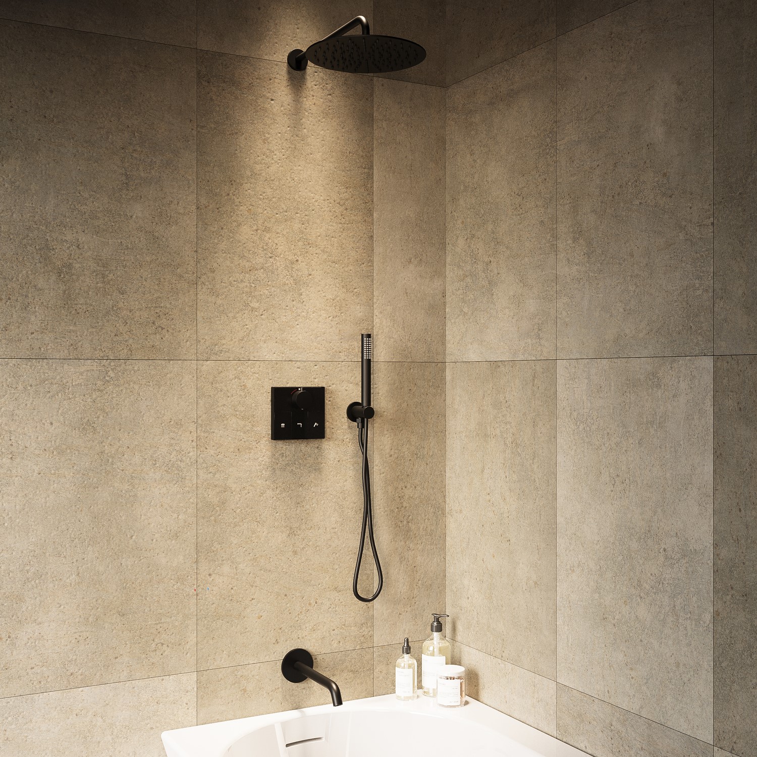 Upgrade your bathroom with the Priya Matt Black Push Button 3 Outlet Concealed Valve, designed to deliver both style and functionality. Its bold matt black finish paired with a sleek glass front makes it the perfect addition to contemporary interiors, while the concealed design ensures a clutter-free, minimalist look. This versatile valve features three outlets, giving you the freedom to switch effortlessly between an overhead shower, bath filler, and handset at the touch of a button. Ergonomic push buttons are easy to operate, enhancing the suitability and practicability for those less-abled. Thermostatic control maintains a safe and consistent water temperature, providing both comfort and peace of mind during use. Built from high-quality brass, zinc, and ABS with a durable electroplated finish, this concealed valve is designed to withstand daily wear while retaining its premium appearance.