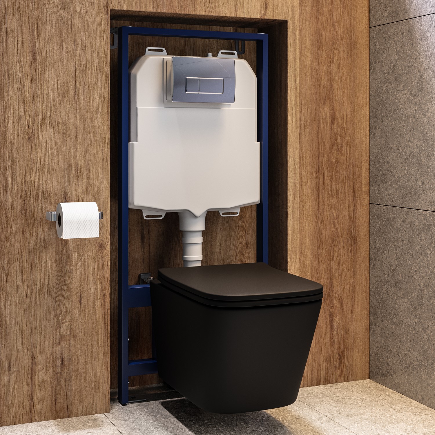 Wall-Hung Matt Black Design: A sleek square rimless pan with a bold matt black finish and matching seat hinges creates a floating effect that’s stylish, hygienic, and easy to clean.