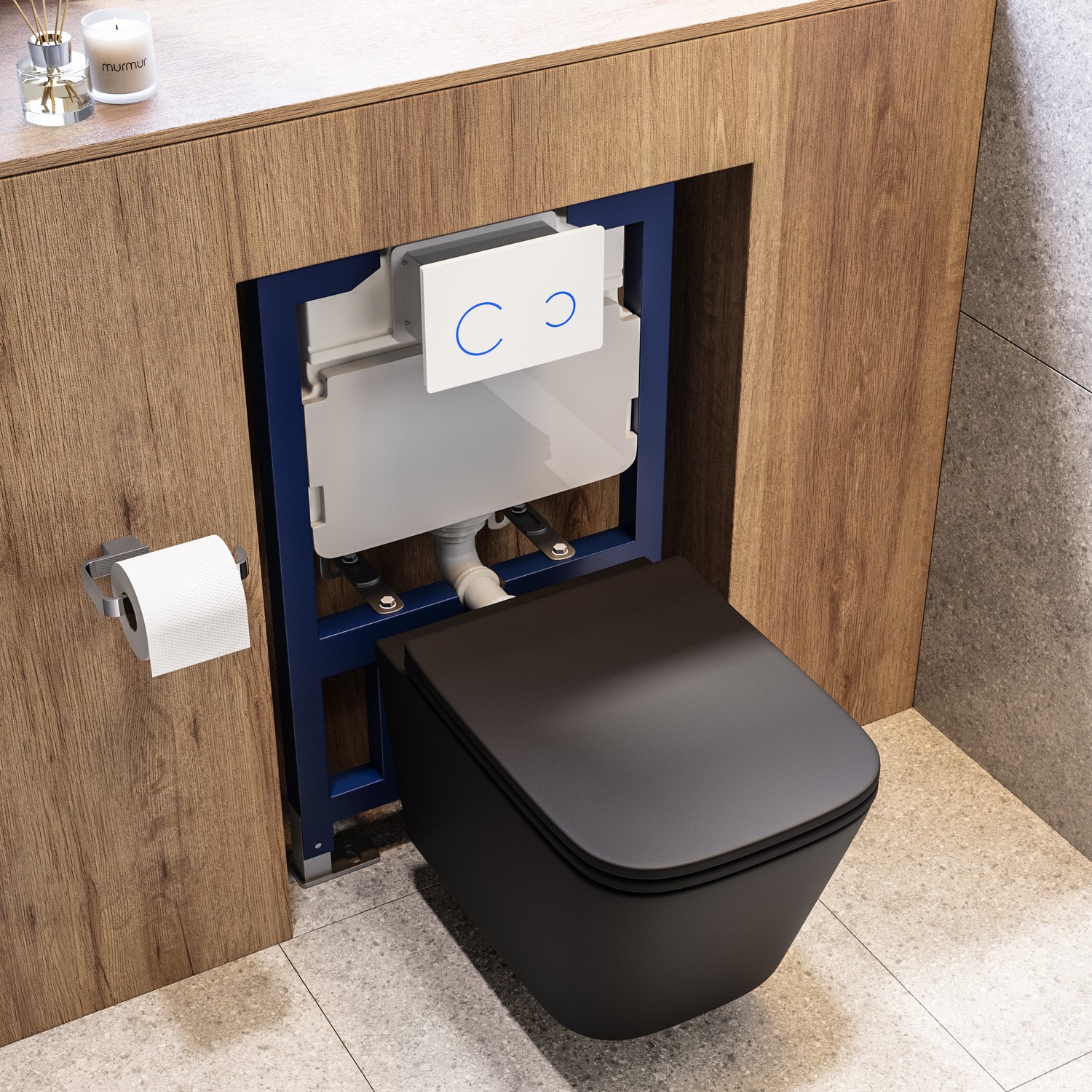 Wall-Hung Matt Black Design: A sleek square rimless pan with a bold matt black finish and matching seat hinges creates a floating effect that’s stylish, hygienic, and easy to clean.