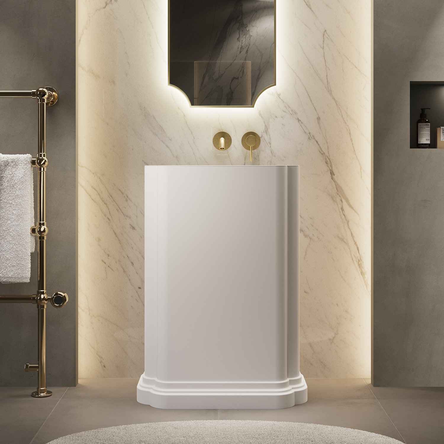 Statement Design: This traditional stone basin creates a striking focal point with its detailed mouldings, sophisticated matt finish and elegant silhouette.