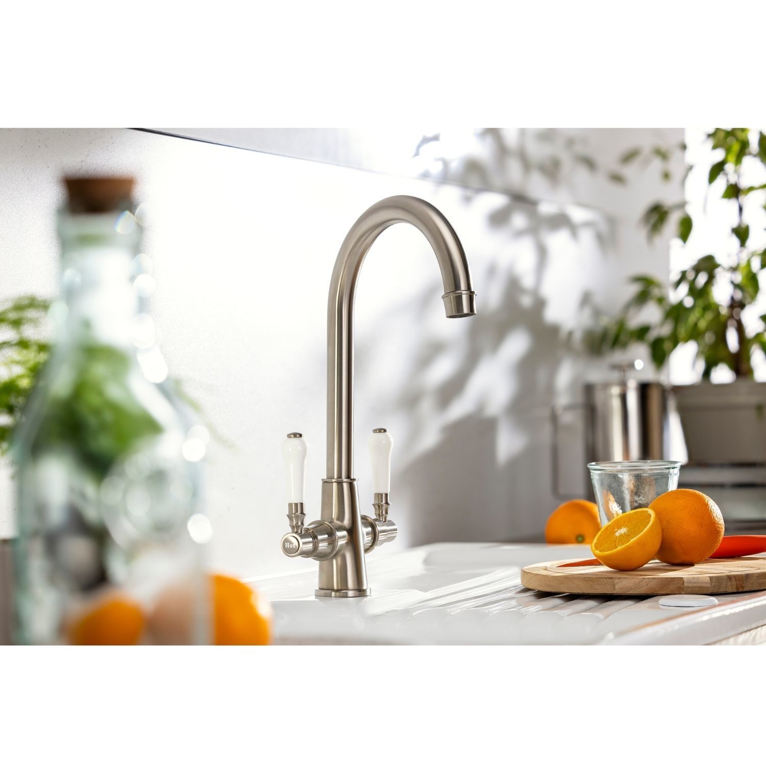 The Abode Keswick Dual Lever Mixer Tap in Brushed Nickel combines timeless elegance with everyday practicality. Featuring a sculpted body, swan neck spout, and white lever handles, it delivers a traditional look with contemporary construction. Ideal for both classic and transitional kitchen spaces, this deck-mounted tap is crafted from solid brass with a brushed nickel galvanic finish. Smooth operation is ensured by the 1/4 turn ceramic disc valves, and the replaceable aerator offers easy upkeep for long-term performance.