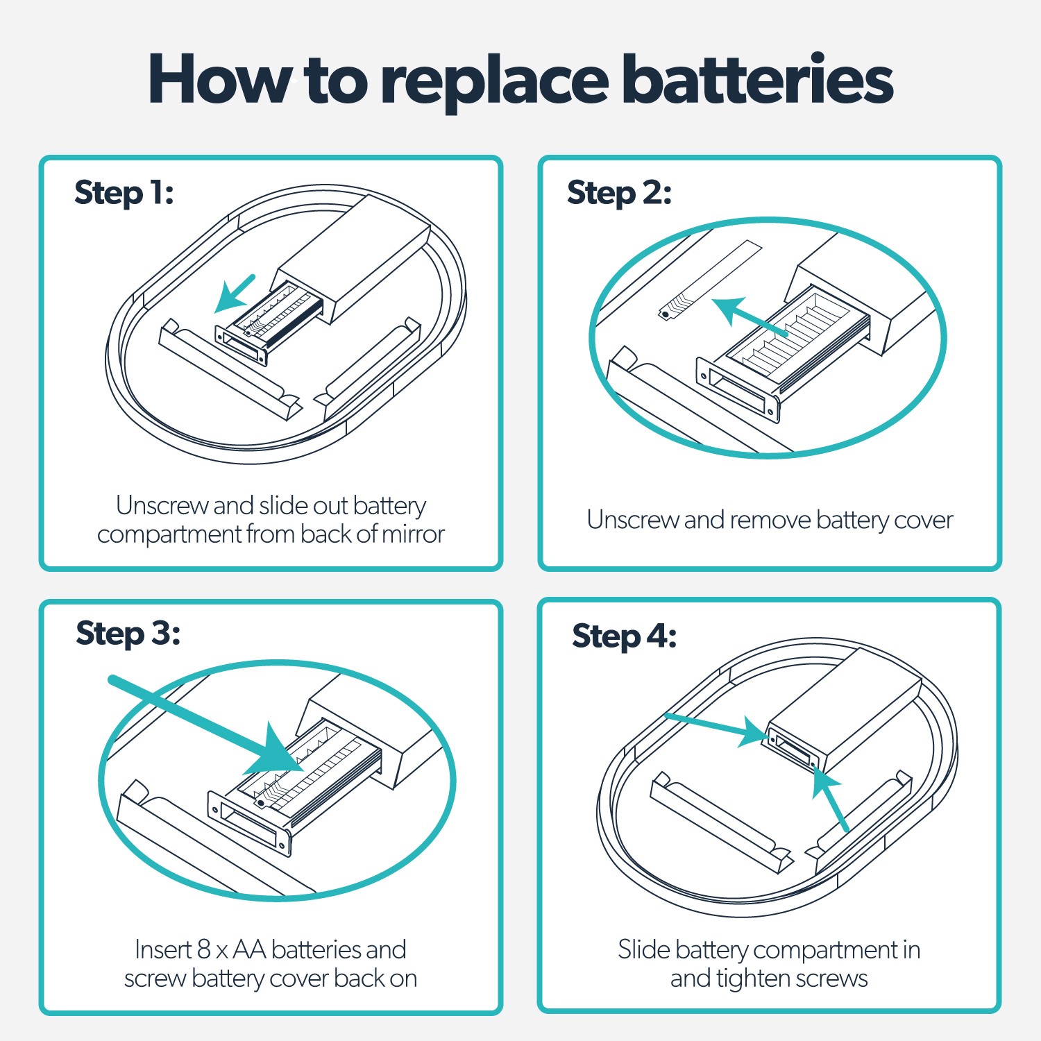 The battery compartment is discretely located on the back of the mirror. Simply remove the cover, insert 8 AA 1.5 V batteries (not included), and reattach the cover. The convenient rocker switch, located at the bottom centre when mounted in portrait orientation, allows easy operation of the backlit feature. This battery operated bathroom mirror is IP44 rated, making it perfectly safe for bathroom use. The oval design with its slim 10mm brushed brass frame adds a contemporary touch whilst providing excellent illumination for your daily routine.