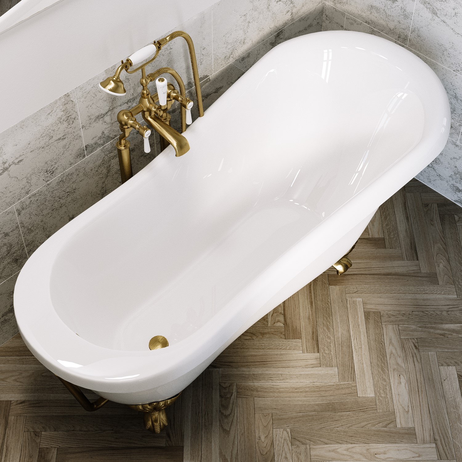 Elevate your bathroom with the Park Royal White Freestanding Single Ended Shower Bath, a stylish blend of vintage character and modern performance. Its elegant roll-top form and brushed brass detailing make it a luxurious focal point, while the durable acrylic body ensures comfort and long-lasting use. Designed with customisable tap placement, it adapts easily to your preferred bathroom layout. Adjustable feet offer added stability, even on uneven floors. Complete with a full fitting kit and backed by a 5-year warranty, this bath brings both style and substance to your space.