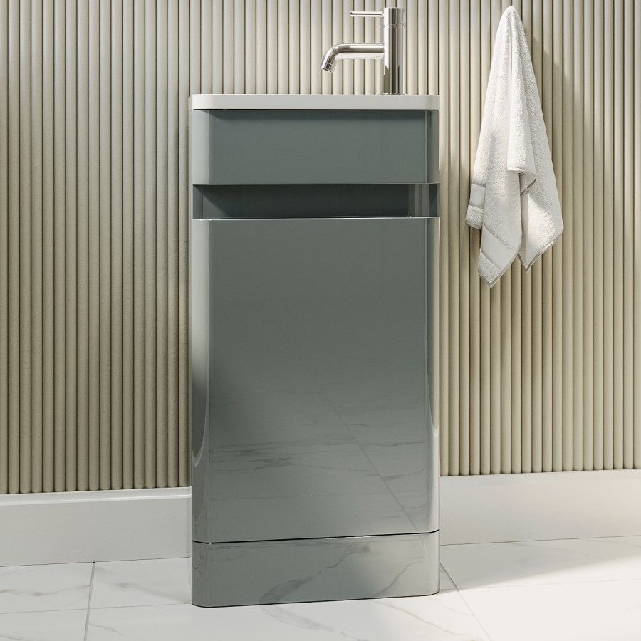 - Sleek, modern light grey floor standing design with seamless, handleless cupboard and integrated basin
