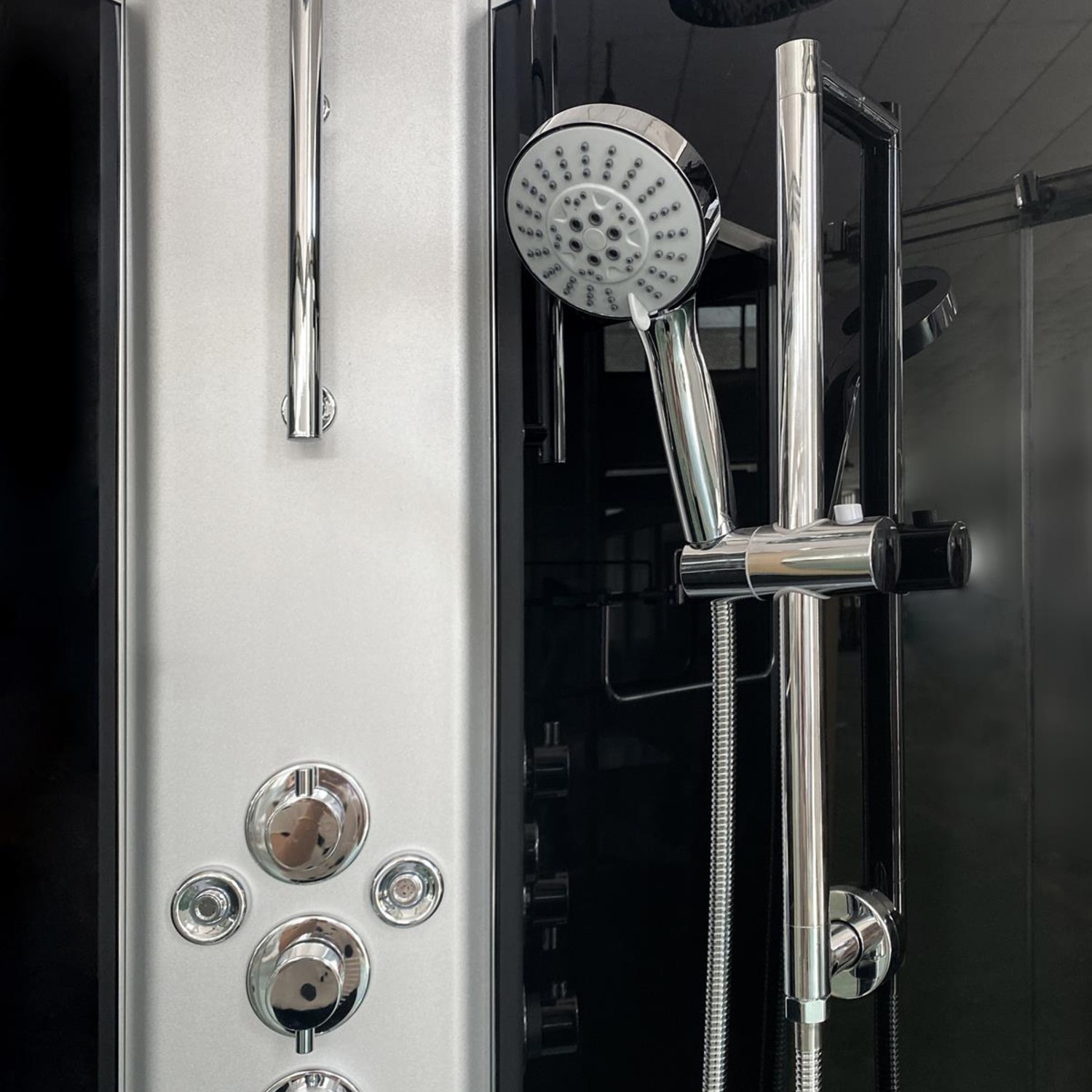 - Shower features: Rainfall shower, multi-spray body jets, hand shower with riser rail