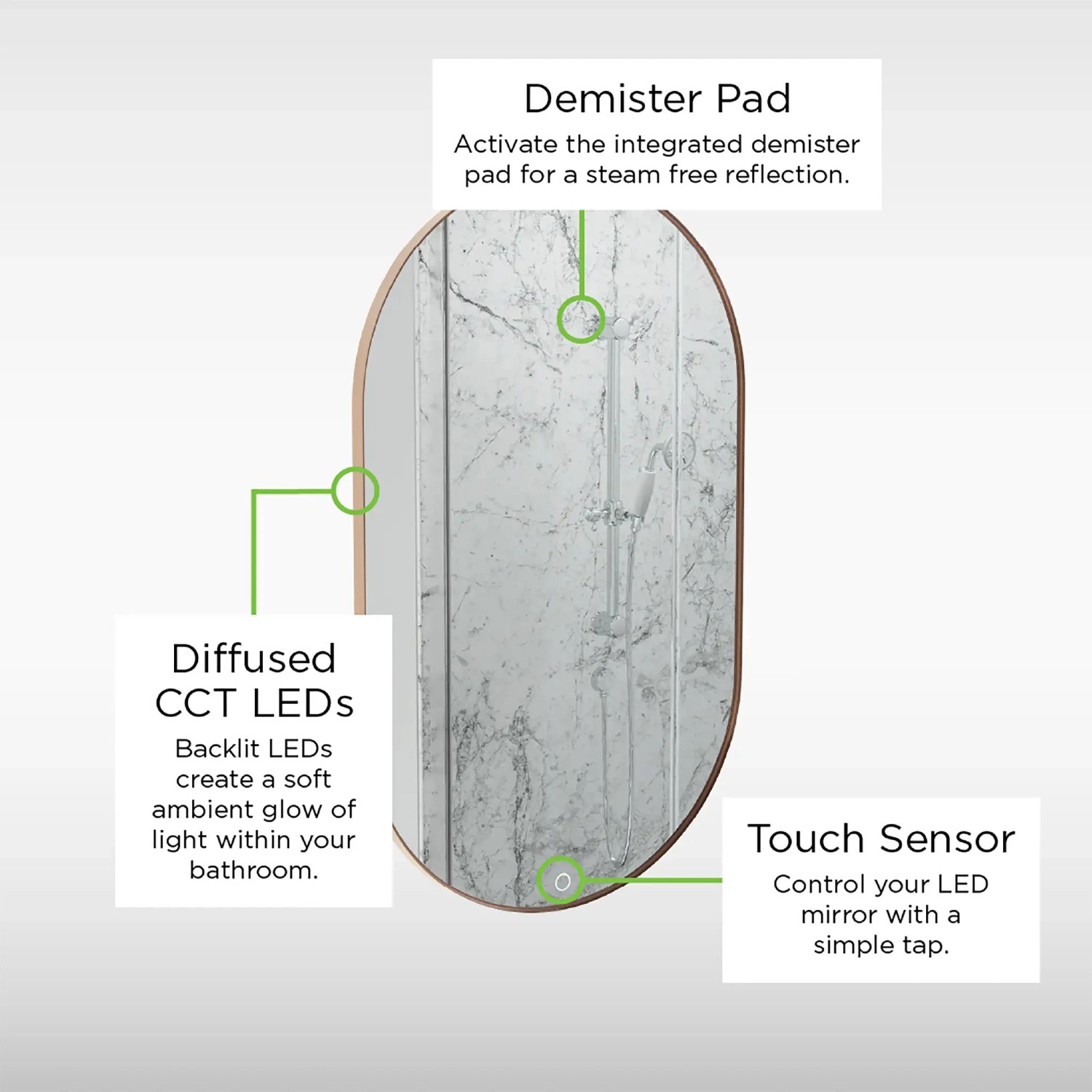 Statement Design: The Nebula's distinctive oval shape and brushed bronze frame create a striking focal point that opens up your bathroom space.