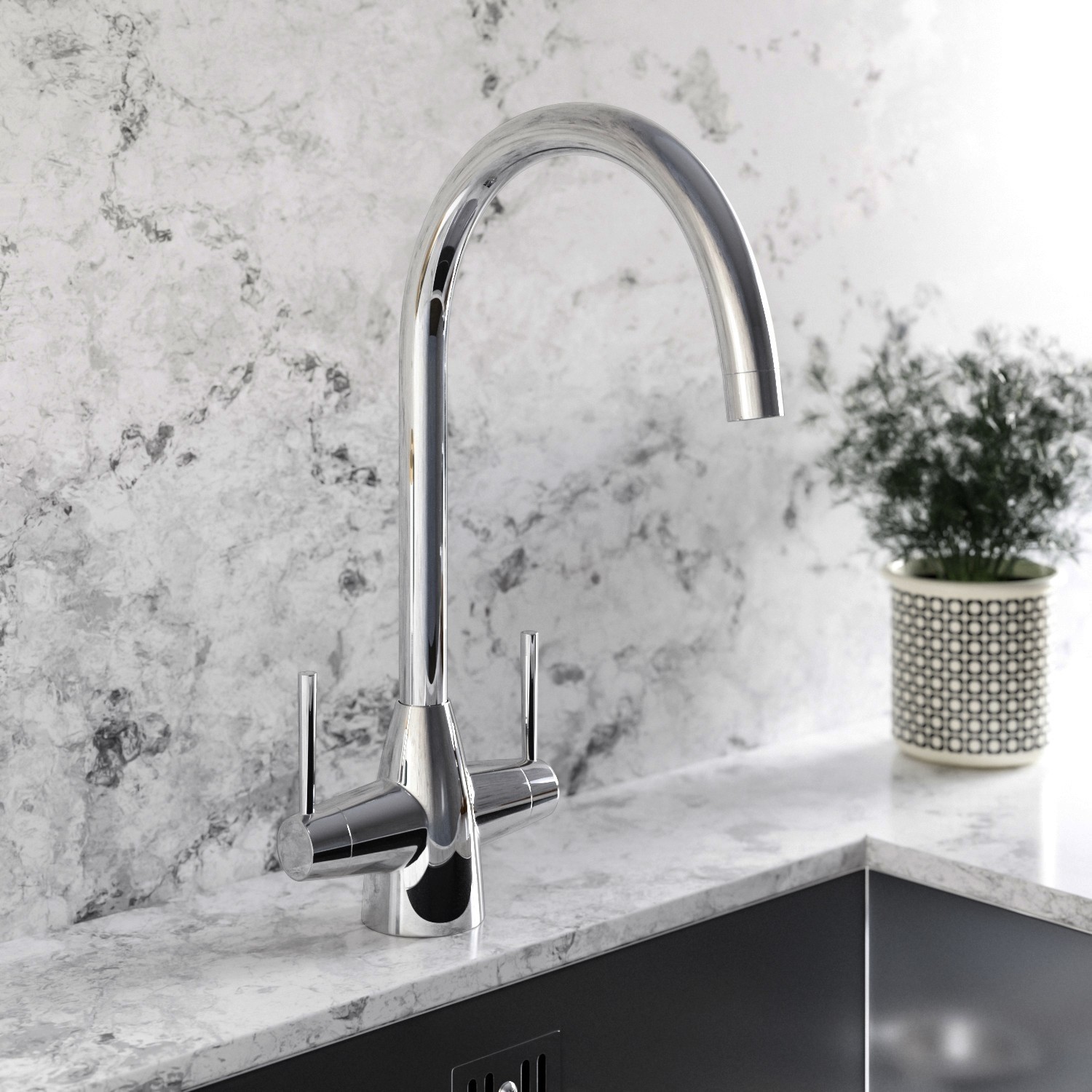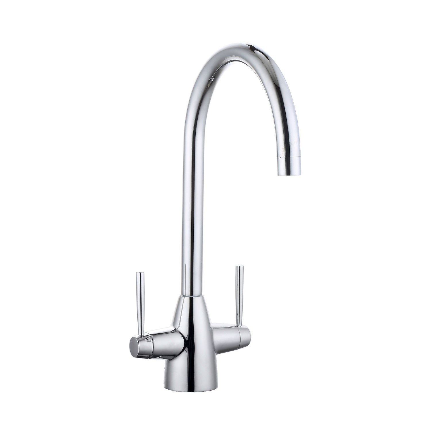 Bring style, precision, and reliability to your kitchen with this beautifully crafted dual-lever tap. Designed with colour-matched handles, it offers effortless control over hot and cold water while adding a coordinated, refined touch to your sink area. The integrated flow aerator ensures a smooth, splash-reduced stream, keeping your worktops cleaner and making everyday tasks more enjoyable. The polished swan-neck spout provides generous height and a sleek, elegant finish, while the smooth swivel function gives you complete flexibility—ideal for one-and-a-half or double bowl sinks. Crafted from high-quality brass, this tap delivers long-lasting strength and dependable performance you can rely on. Suitable for low to high water pressures, it’s designed to work seamlessly in a wide range of homes. With tap tails included, installation is quick and straightforward. And for added peace of mind, the tap is backed by a reassuring 5-year warranty, ensuring lasting quality and confidence.
