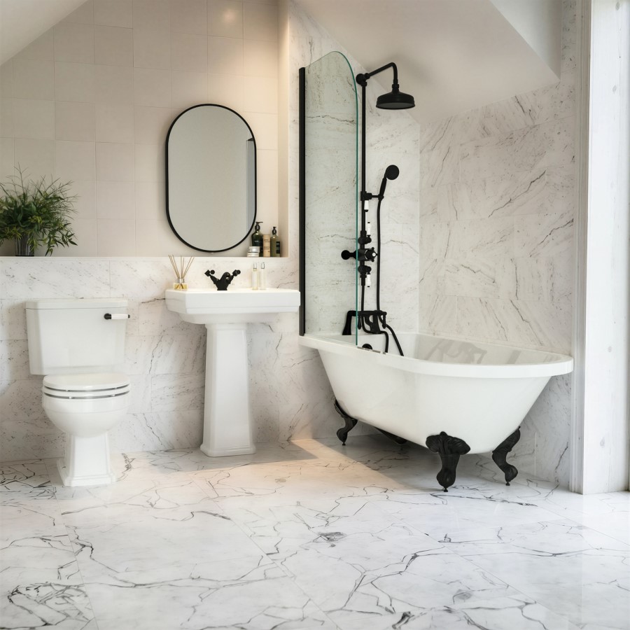 Victorian Style Suite: A complete bathroom set featuring 1670mm bath with black shower screen, close coupled toilet, and full pedestal basin for a coordinated traditional look.
