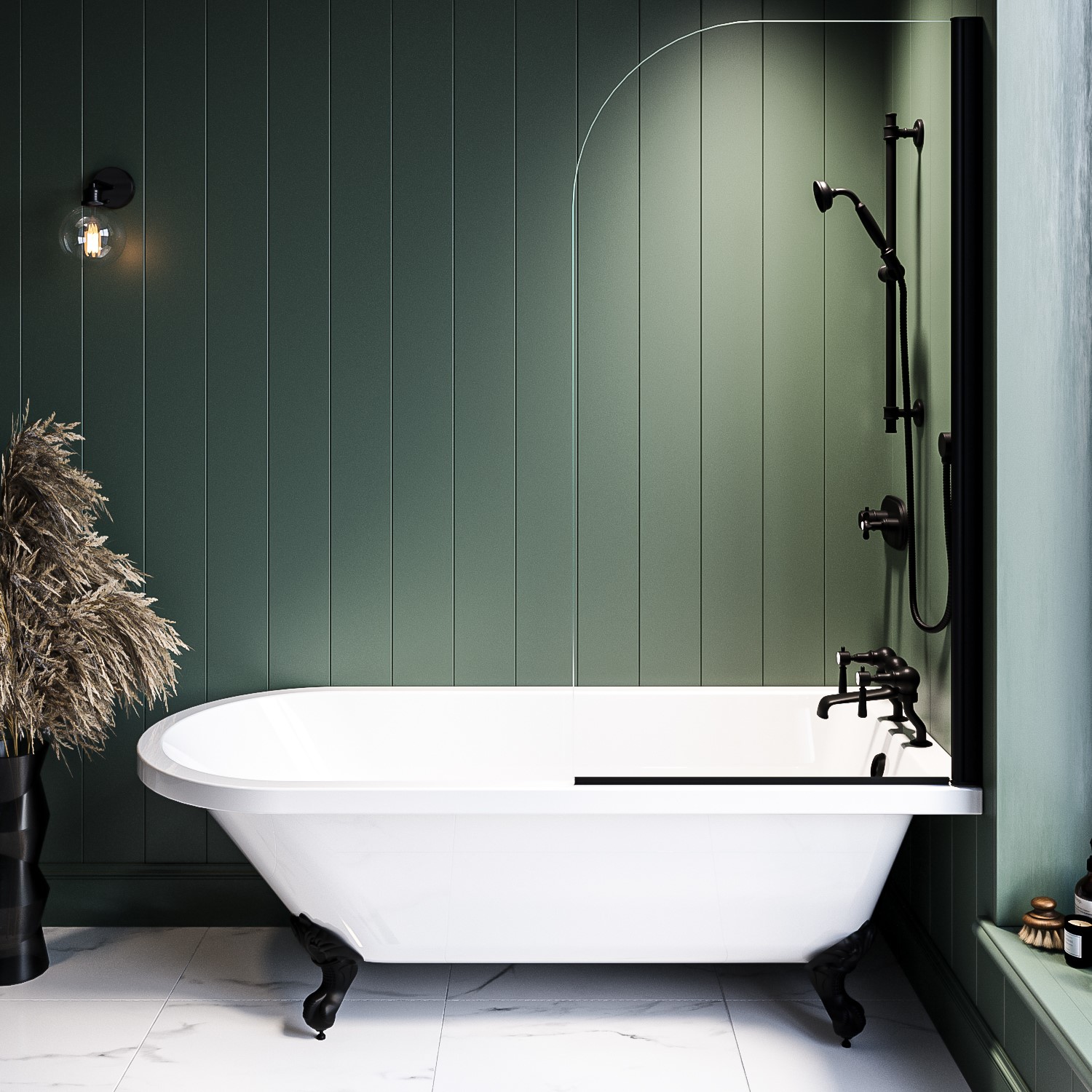 Make a statement in your bathroom with our traditional Park Royal shower bath suite. Roll-topped and single-ended, the bath features smooth, curved edges for a luxurious and relaxing bathing experience. The gloss finish enhances its timeless appeal, while the beautifully ornate matt black ball and claw feet add a striking contrast. The traditional curved design fits neatly into your bathroom, and the bath screen is reversible, meaning the shower bath can be installed into a left or right corner, and its adjustable feet ensure a level fit. Made from 4-6mm acrylic, reinforced with fibreglass for durability the bath is resistant to staining, chipping, and cracking, ensuring longevity. The hinged bath screen rotates 90° both inward and outward for easy access, and is made from toughened 6mm safety glass with an easy-clean finish, meaning water runs off the glass easily for less wiping. With no pre-drilled tap holes, you have the option to use deck or wall mounted taps (sold separately).