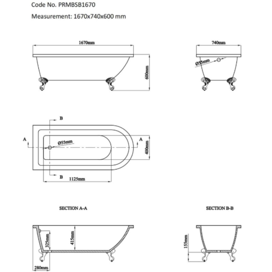 - Bath Dimensions: L1670 x H600 x W740mm (+/-10mm tolerance)