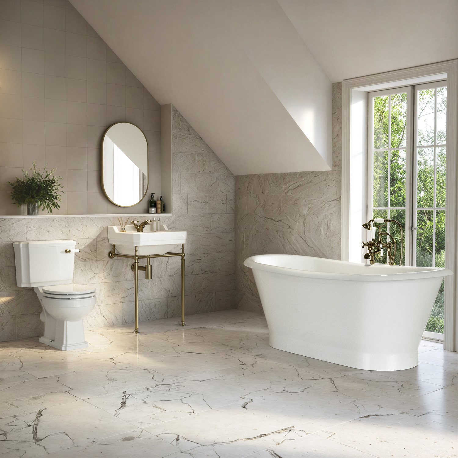 Victorian Style Suite: A complete bathroom set featuring 1690mm freestanding double-ended bath, close coupled toilet, and brass washstand basin.