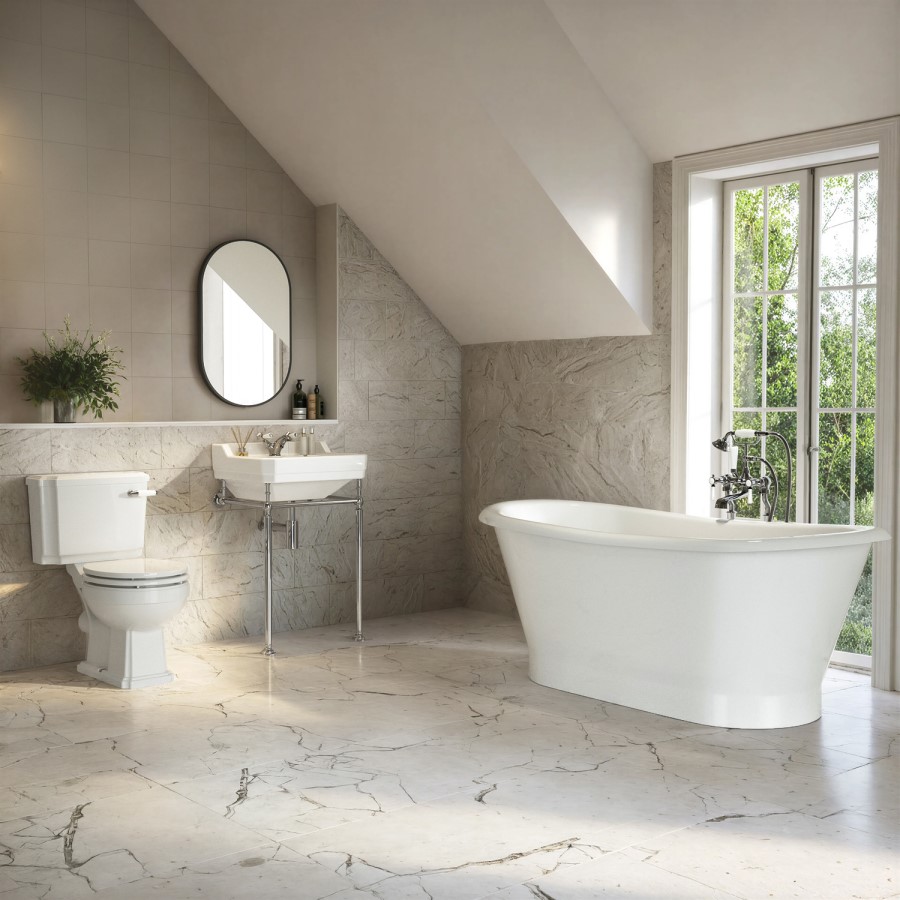 Victorian Style Suite: A complete bathroom set featuring 1690mm freestanding double-ended bath, close coupled toilet, and chrome washstand basin.