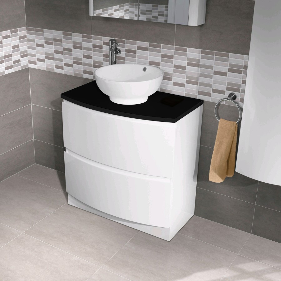 The Voss™ 810 Floor Mounted Vanity Black Countertop Drawer Unit is a beautifully crafted bow front vanity unit with matching black countertop. The 2 soft close deep-fill drawers provide plenty of storage and the stylish design makes this vanity unit the perfect choice. 3 stunning countertop basins are available to choose from the drop down options and each perfectly compliments this fantastic unit. Also available in the Voss™ range is a WC unit storage units and mirrored cabinets so you can really create the complete look in your bathroom.