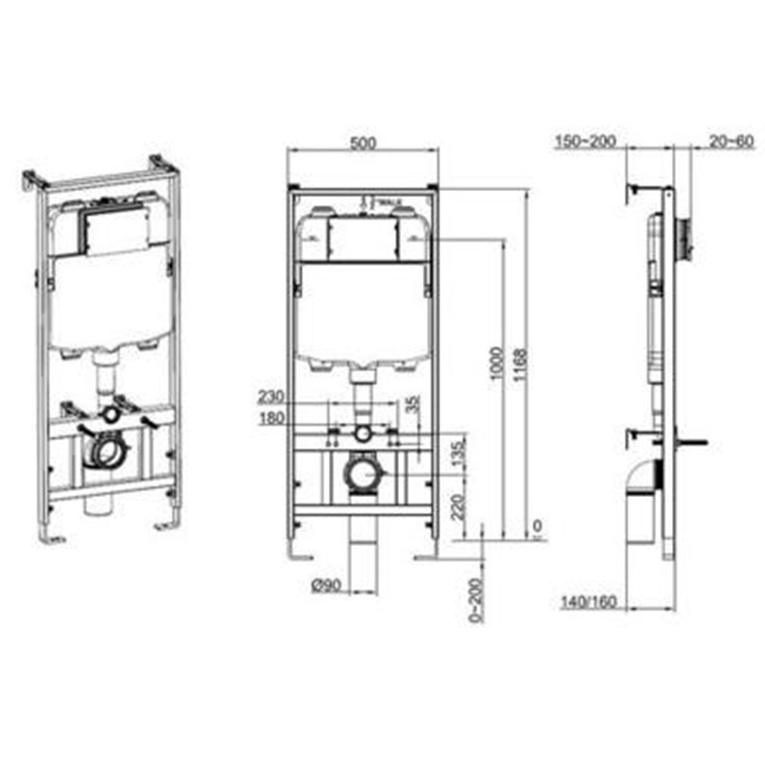 - Frame dimensions: H1168 x W500 x D150-200mm