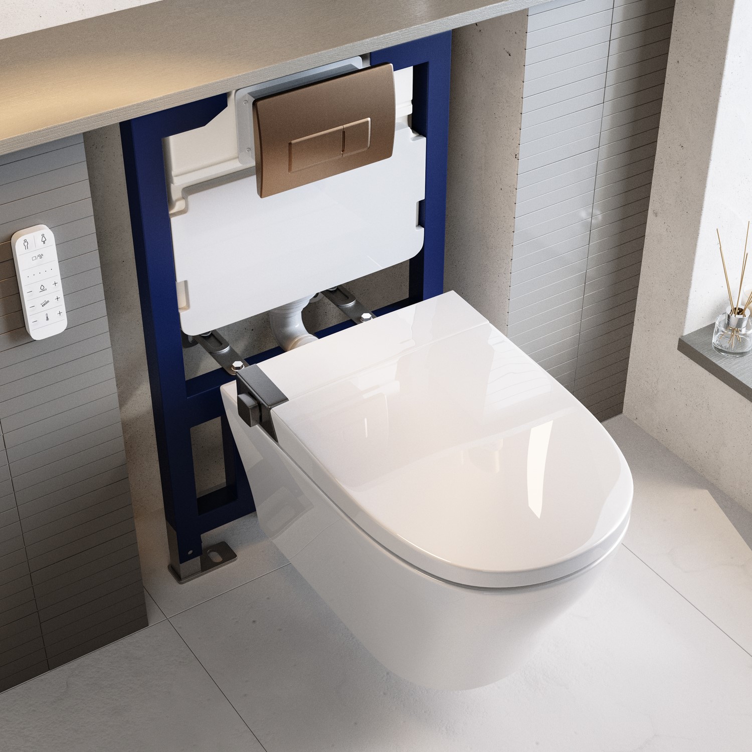 Control your smart toilet using the remote that attaches to a wall or via the on-seat control.