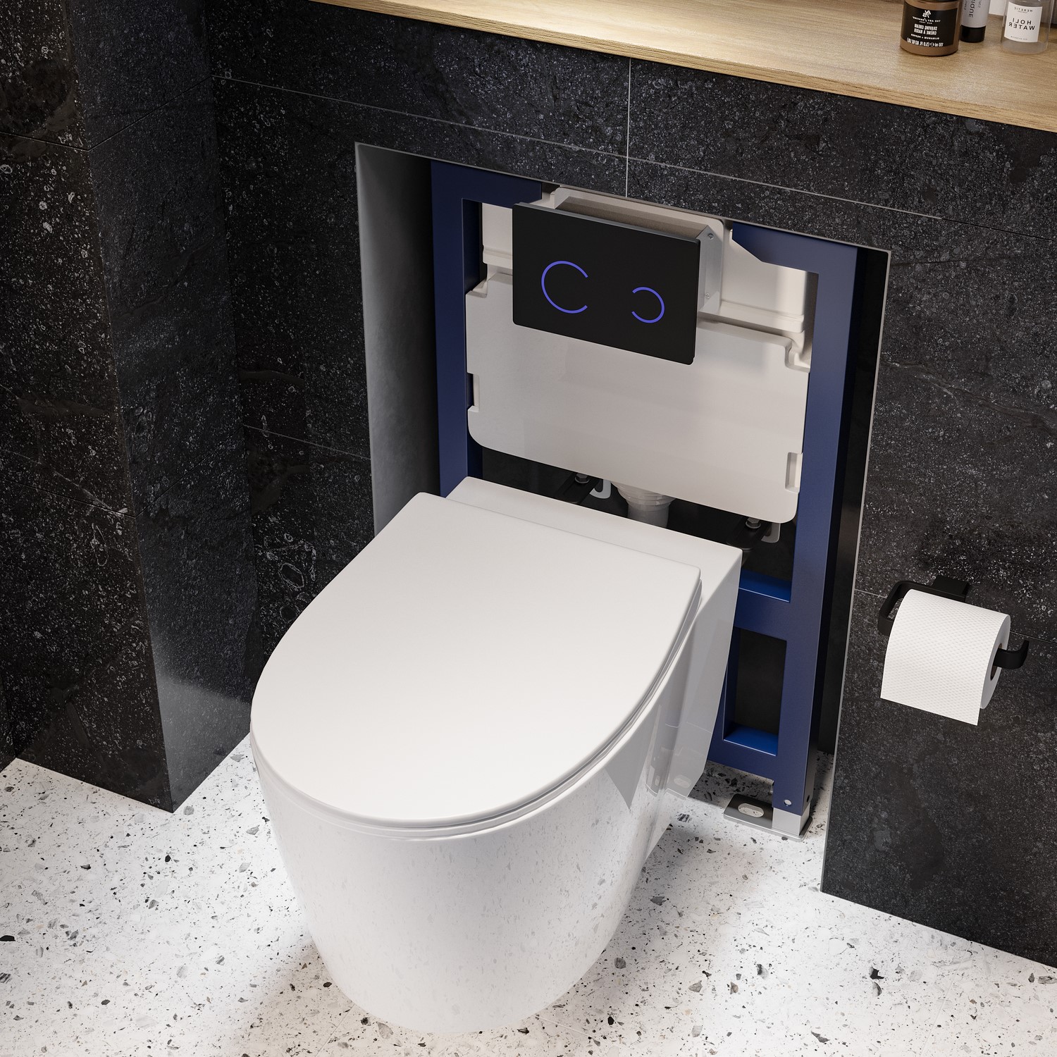 The Purificare Black Glass Sensor pneumatic flush plate adds a contemporary and sophisticated finishing touch to your wall-hung toilet. Its stylish water-saving dual flush button, paired with the adjustable 820mm pneumatic compact frame, creates a modern effect, especially in height-restricted spaces, like underneath a window. With an adjustable frame up to 200mm, you can customise the height of your toilet and flush button for a perfect fit. Designed for easy installation and maintenance, the flush plate is easy to clean and can be removed for quick access. The tank is covered to reduce noise and condensation, ensuring a peaceful bathroom experience. The flush plate comes with a 1-year warranty, and the frame with cistern is also backed by a 1-year warranty.