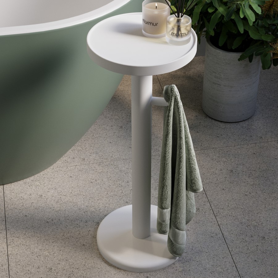 - This bath table features a sleek, circular design that effortlessly complements any modern bathroom.